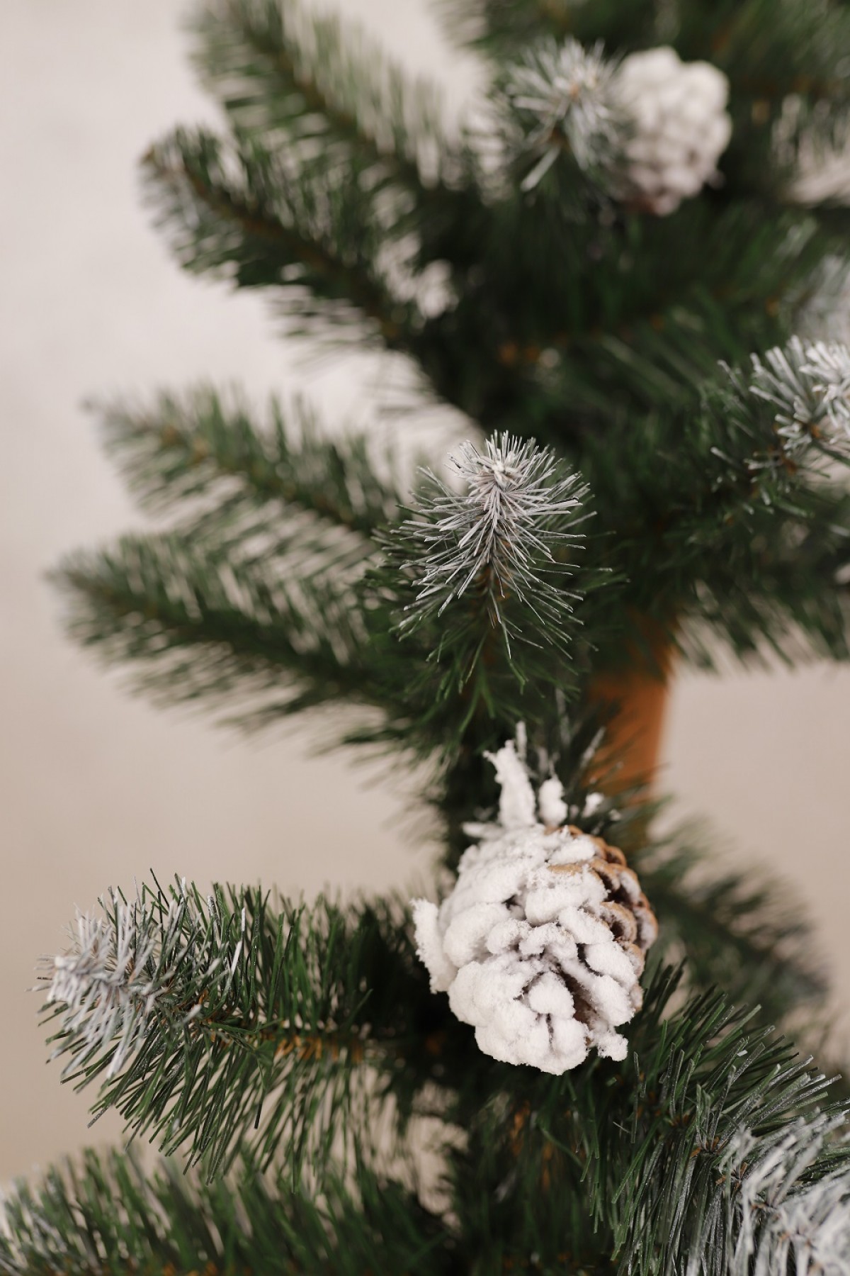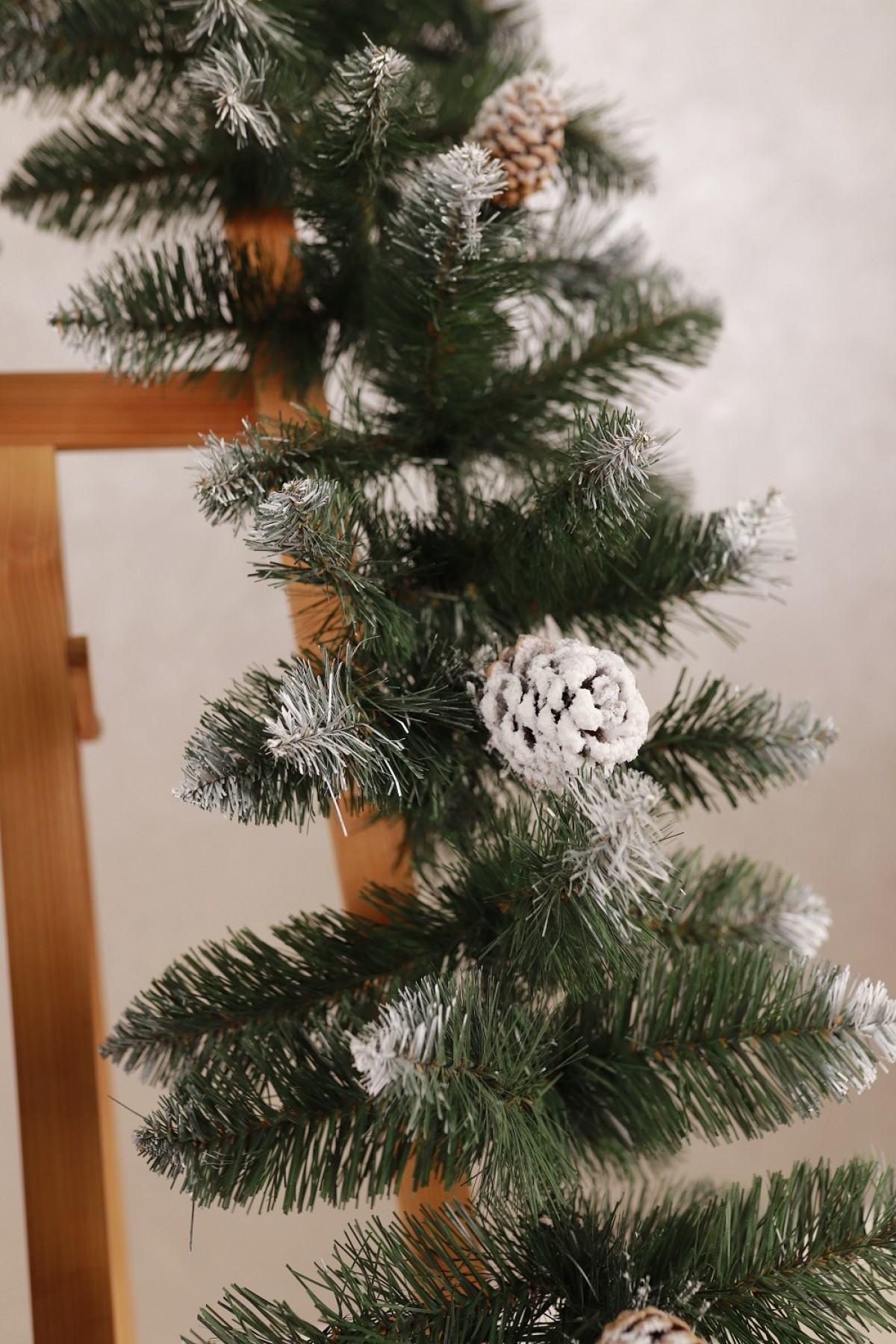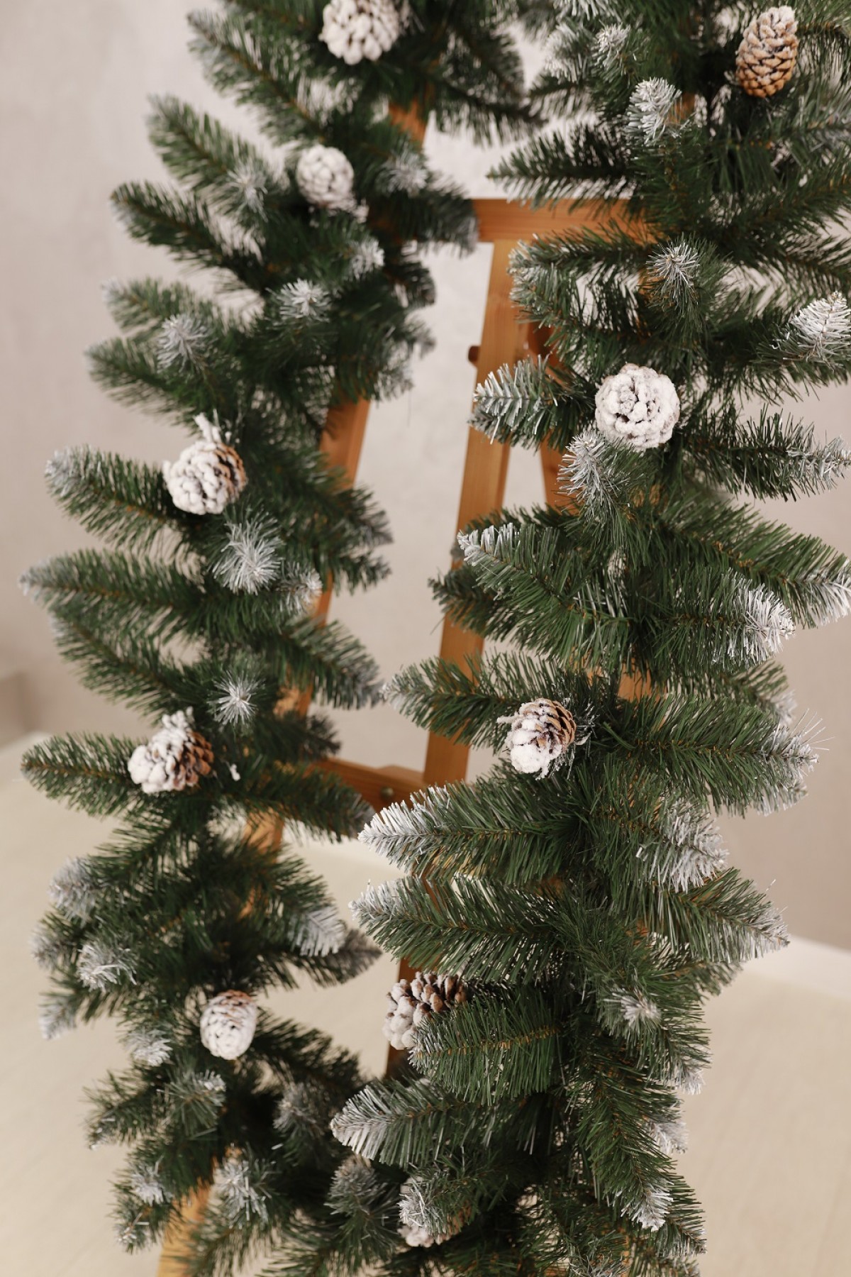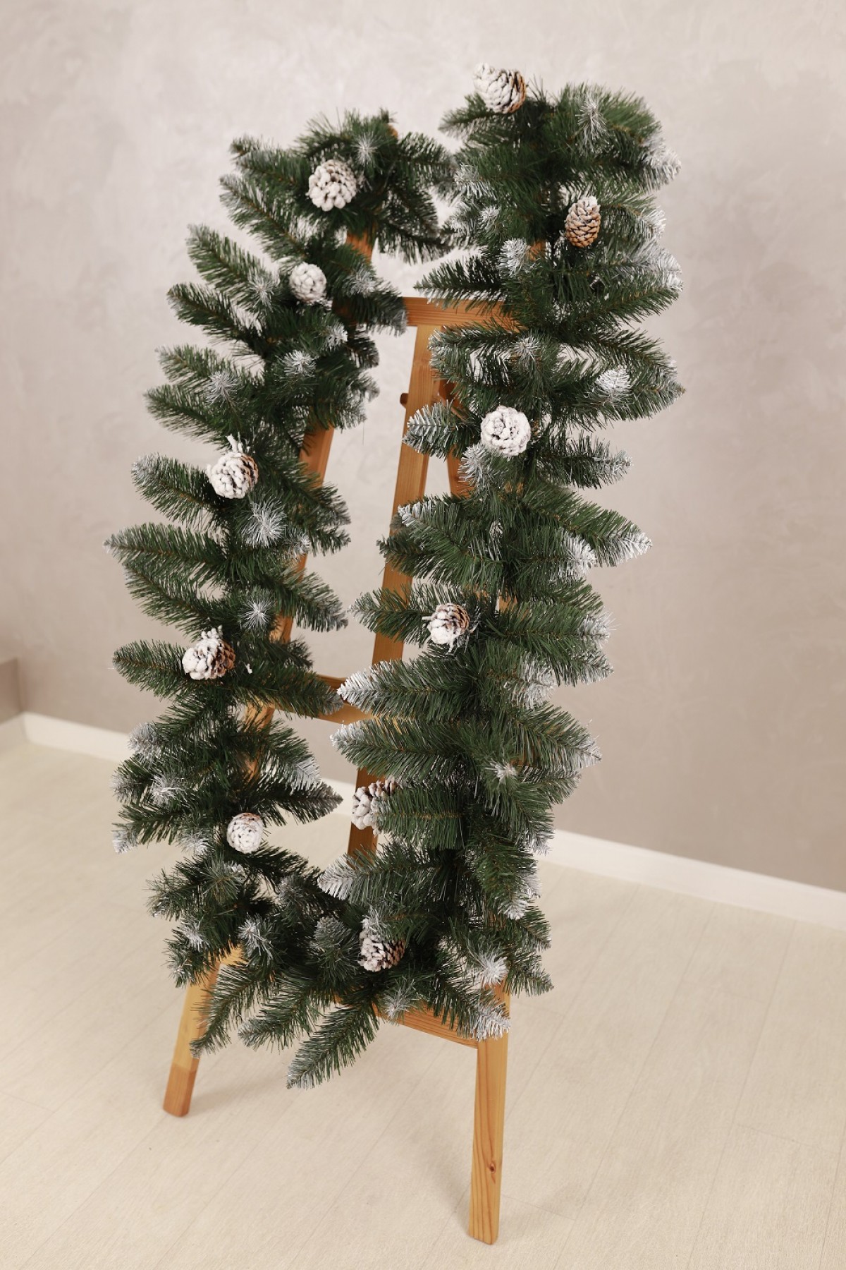 Різдвяна гірлянда з шишками призначена для прикраси будинку, квартири, офісу, салону, кабінету, або іншого простору напередодні зимових свят. Гірлянду розміщують в отворі дверей, вікон, на каміні, перилах, а також інших поверхнях. Новорічний аксесуар виготовлений з якісної штучної хвої насиченого зеленого кольору та білими кінчиками. Гірлянда має довжину 2,8 метри, крона складається з 34 ярусів, а на кожному ярусі розташовані 4 гілочки.