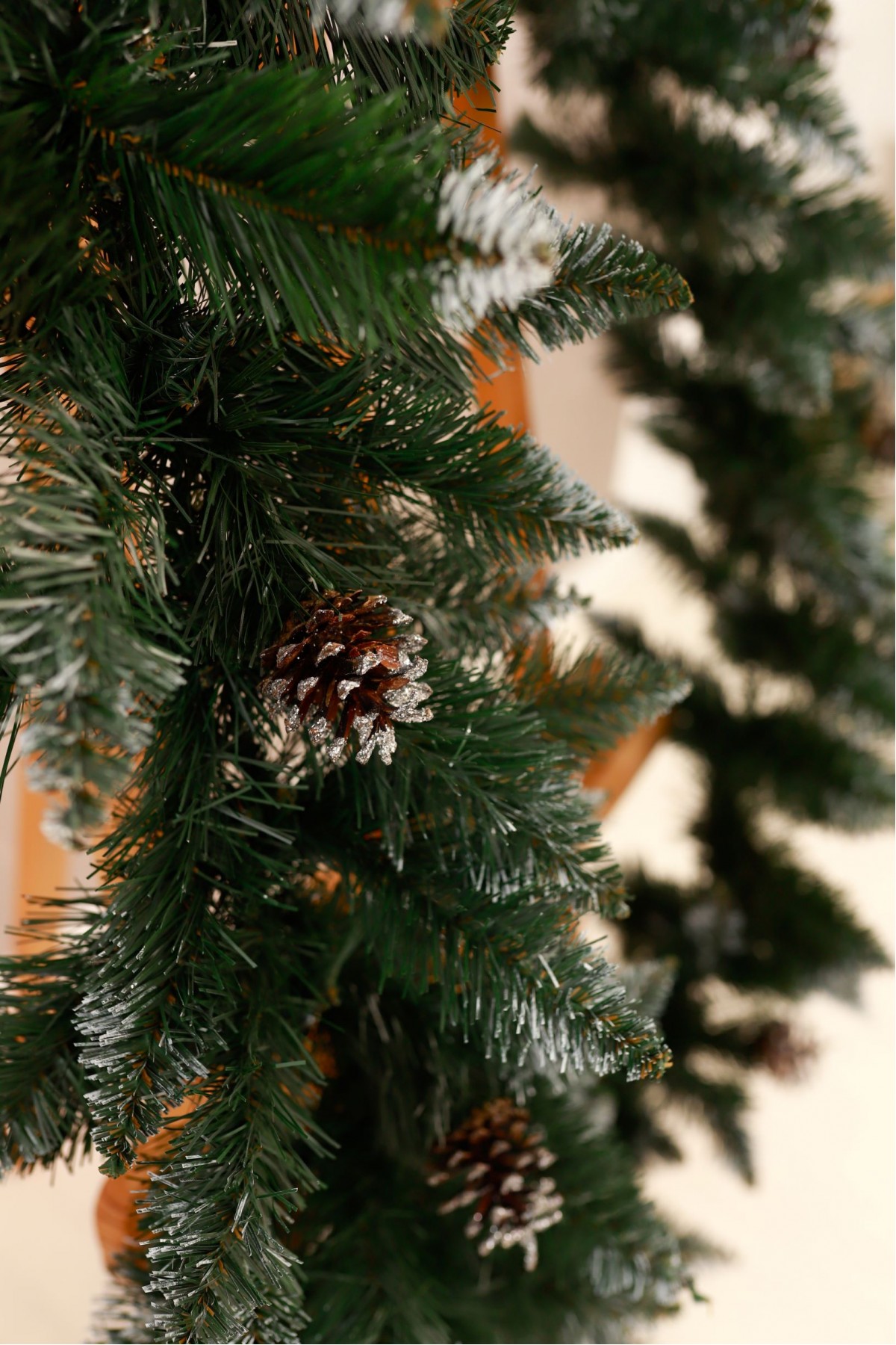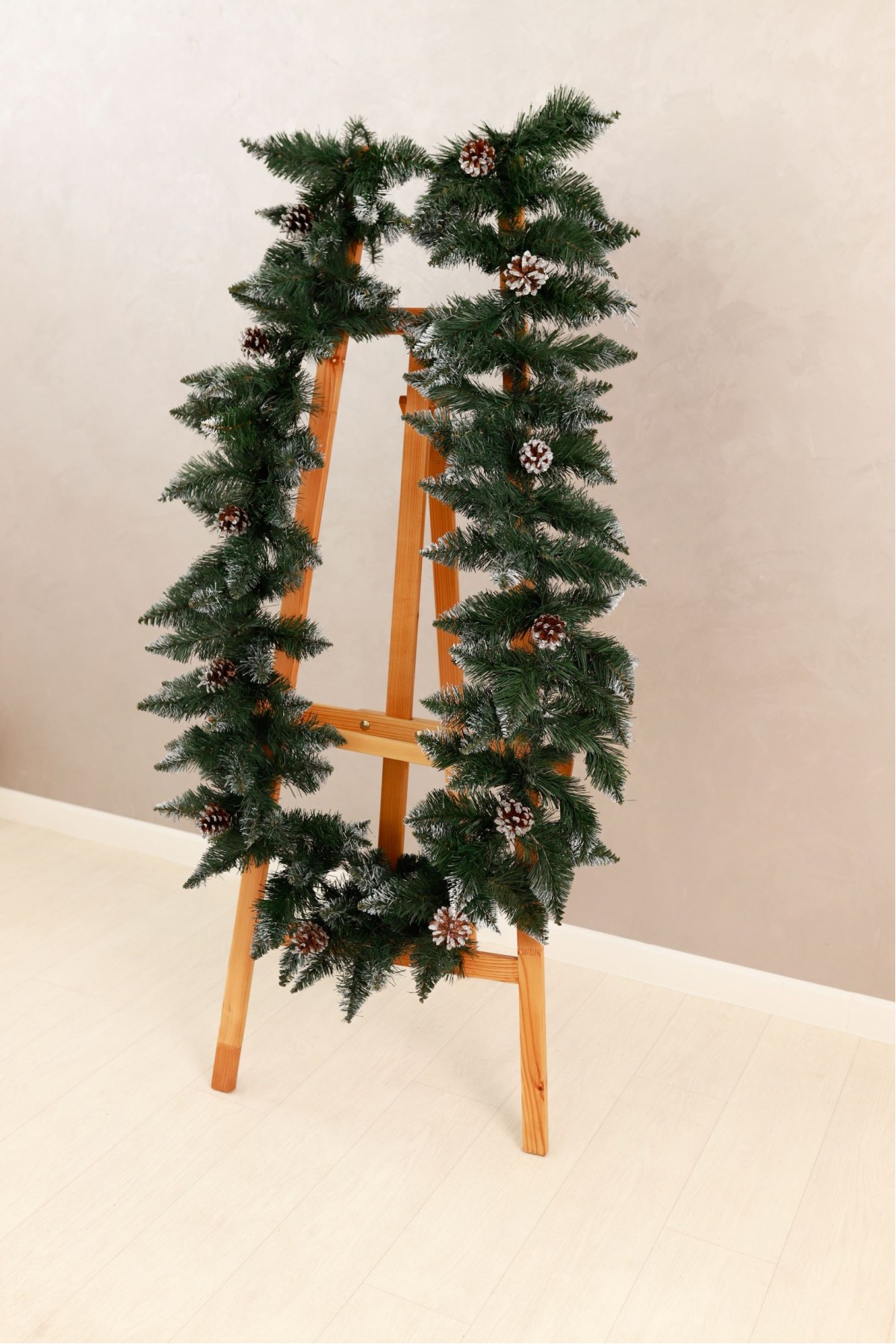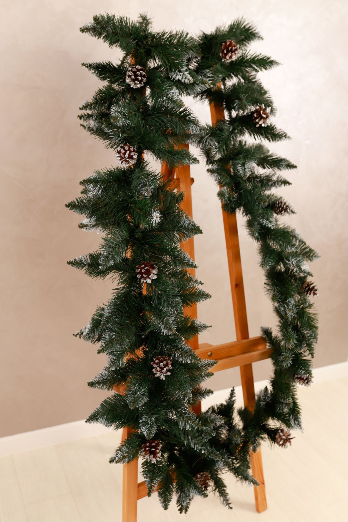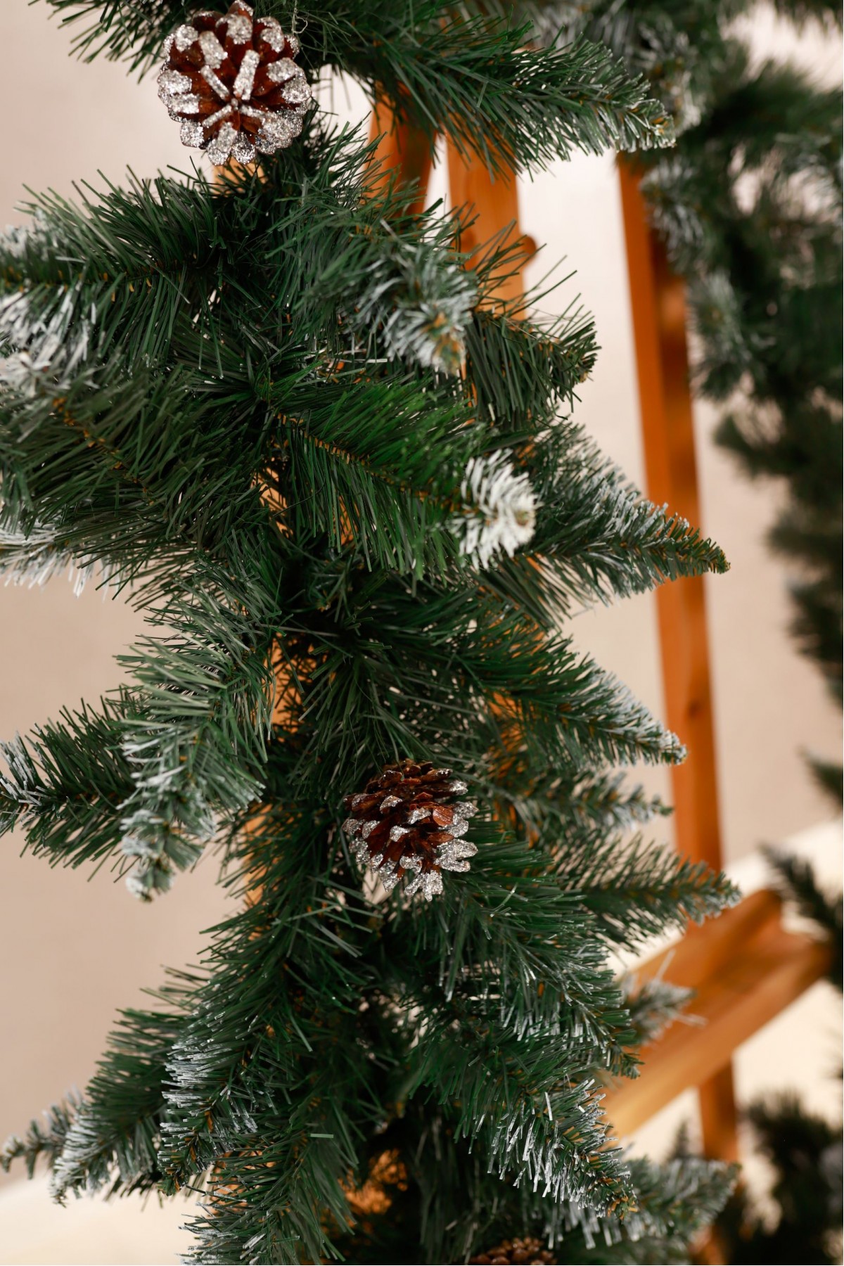 Різдвяна гірлянда з шишками призначена для прикраси будинку, квартири, офісу, салону, кабінету, або іншого простору напередодні зимових свят. Гірлянду розміщують в отворі дверей, вікон, на каміні, перилах, а також інших поверхнях. Новорічний аксесуар виготовлений з якісної штучної хвої насиченого зеленого кольору та білими кінчиками. Гірлянда має довжину 3 метри, крона складається з 34 ярусів, а на кожному ярусі розташовані 4 гілочки.