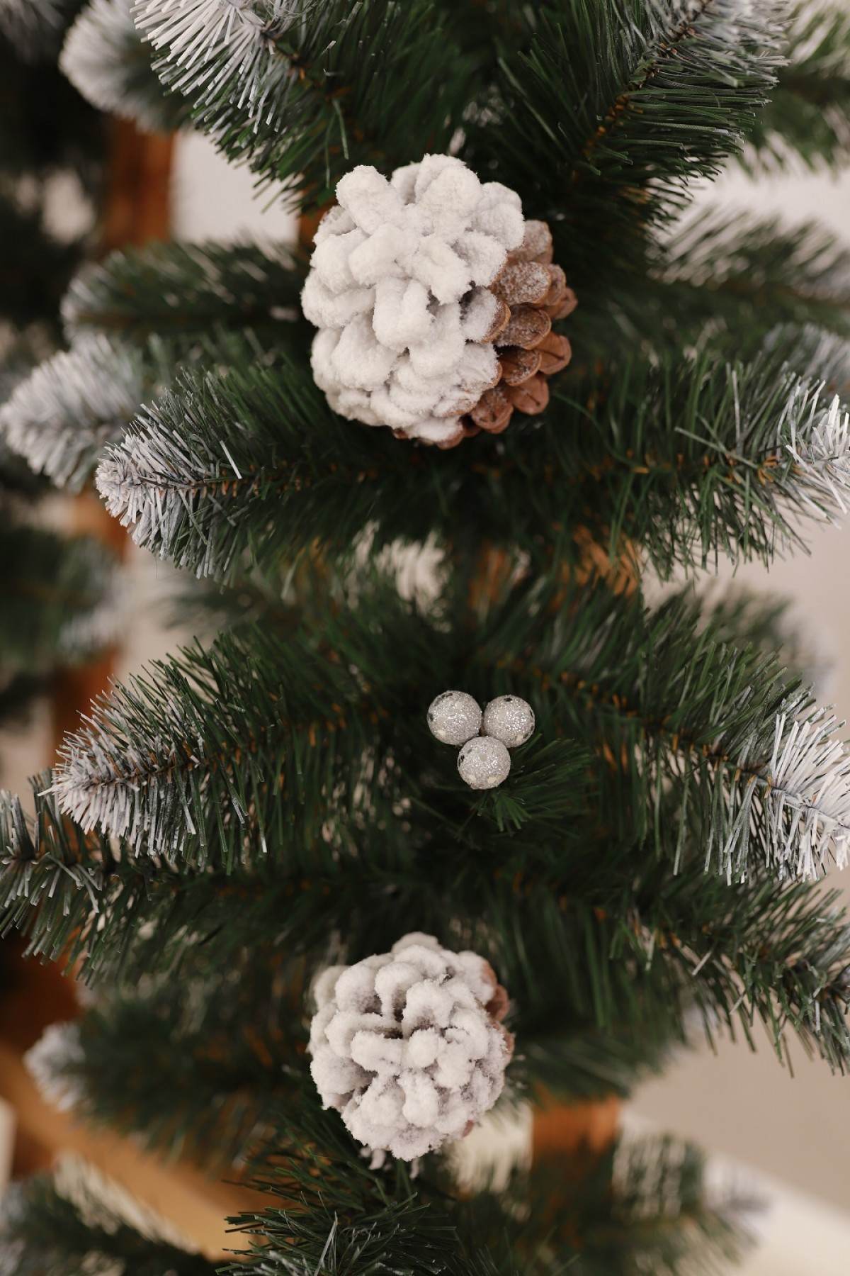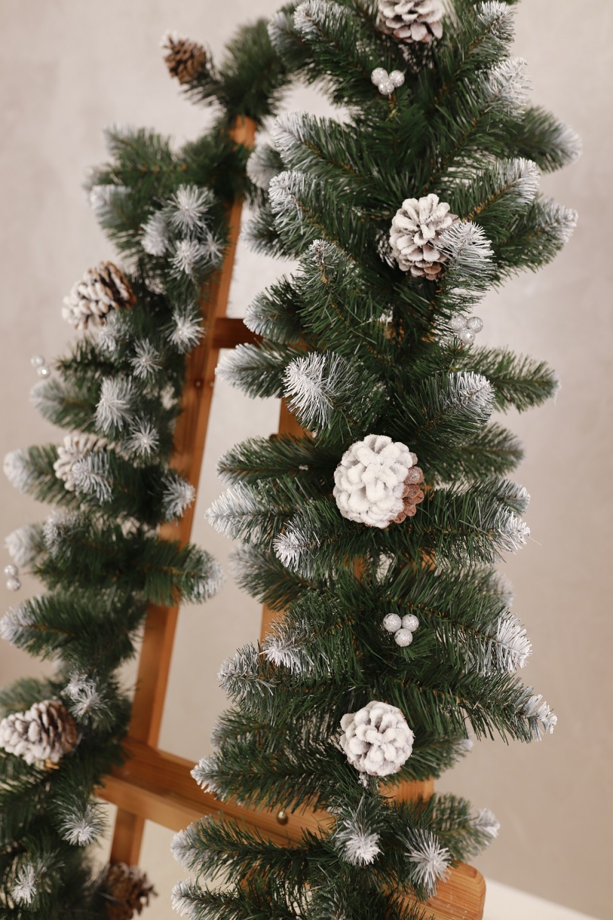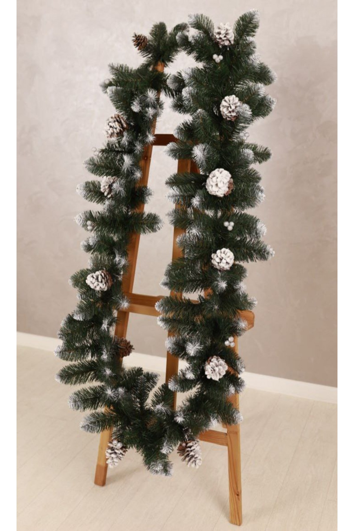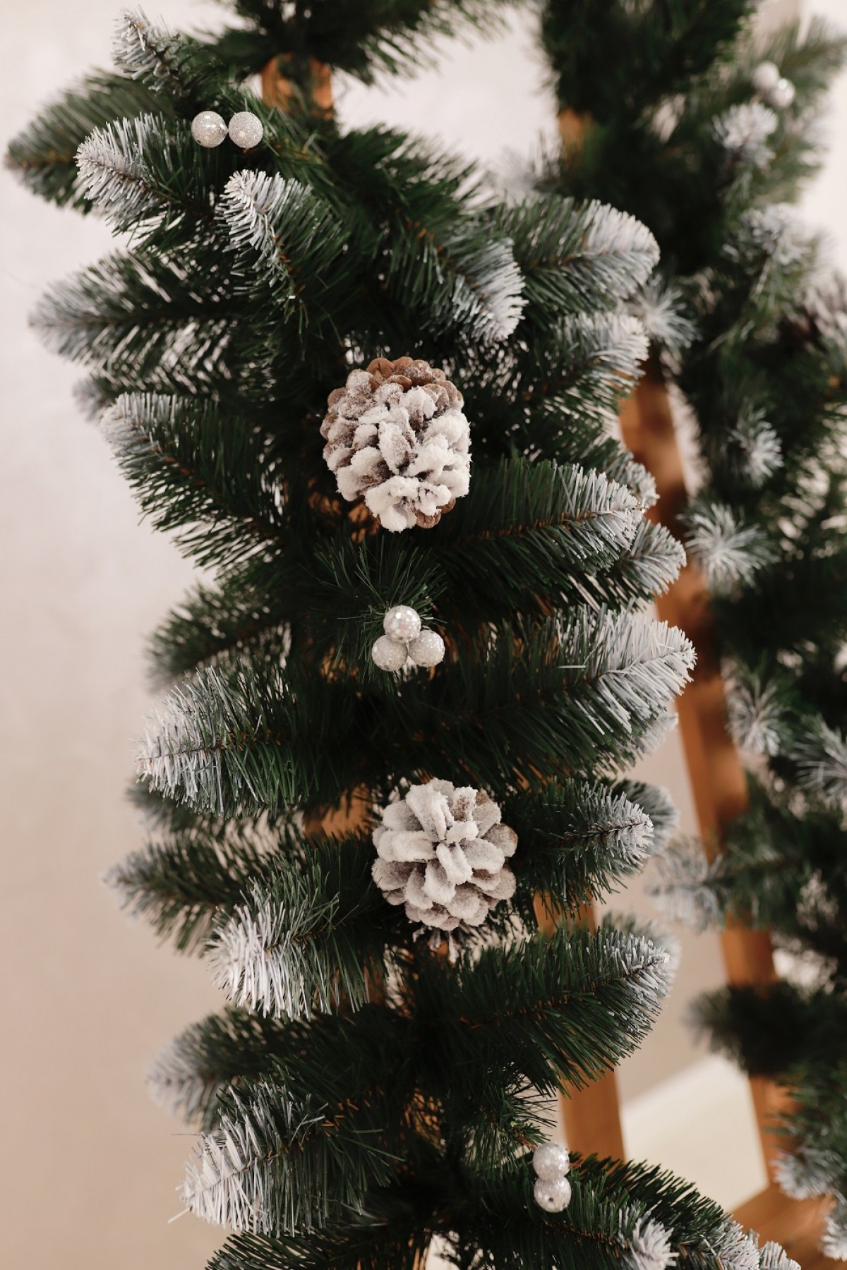Різдвяна гірлянда з шишками та калиною призначена для прикраси будинку, квартири, офісу, салону, кабінету, або іншого простору напередодні зимових свят. Гірлянду розміщують в отворі дверей, вікон, на каміні, перилах, а також інших поверхнях. Новорічний аксесуар виготовлений з якісної штучної хвої насиченого зеленого кольору та білими кінчиками. Гірлянда має довжину 2,8 метри, крона складається з 34 ярусів, а на кожному ярусі розташовані 4 гілочки.
