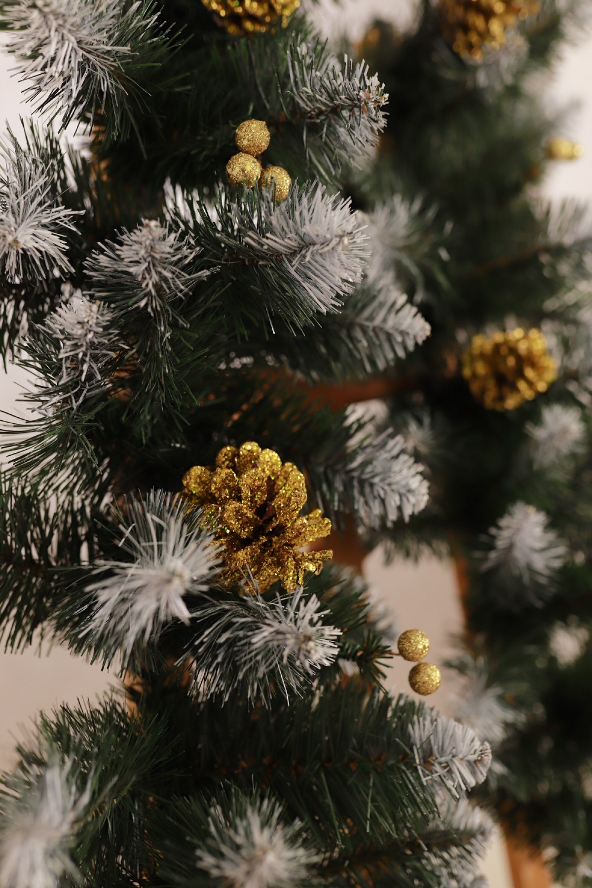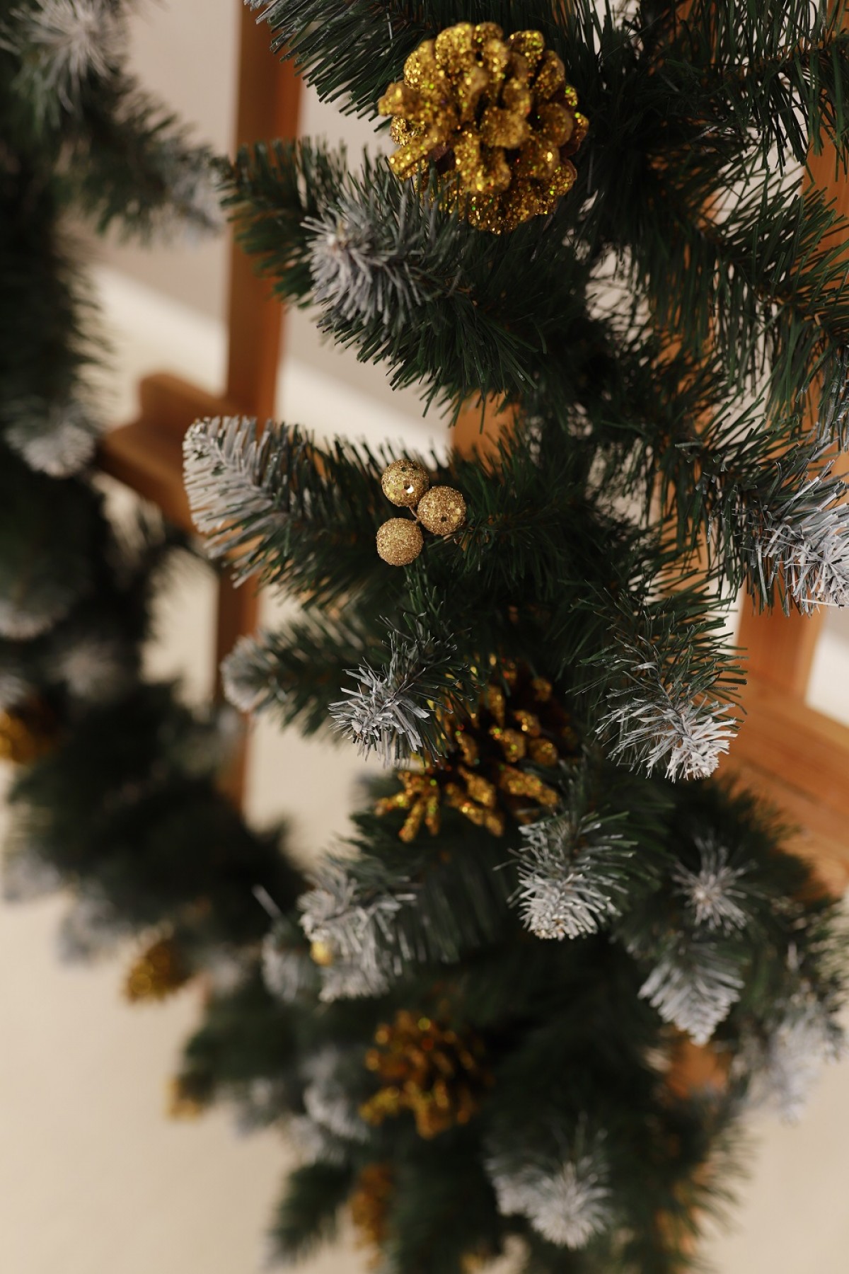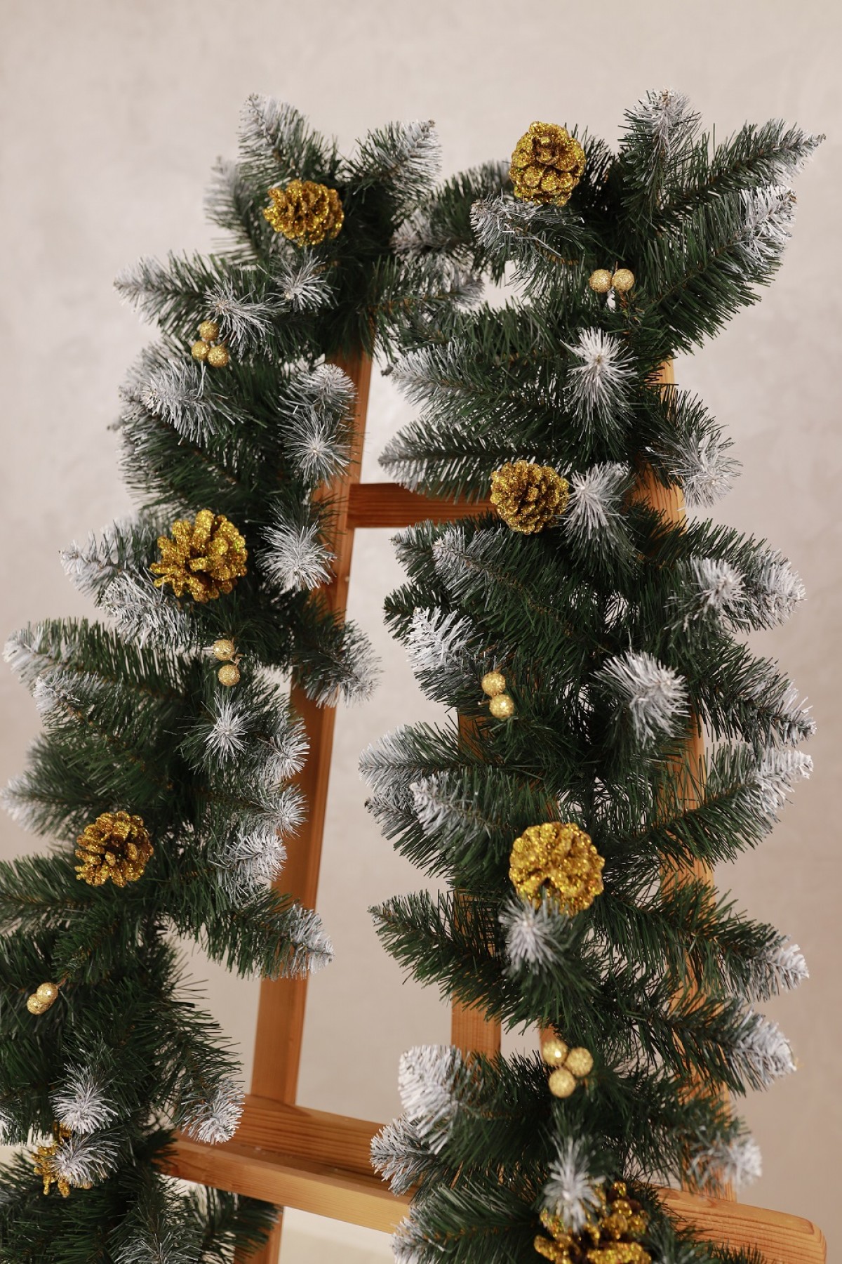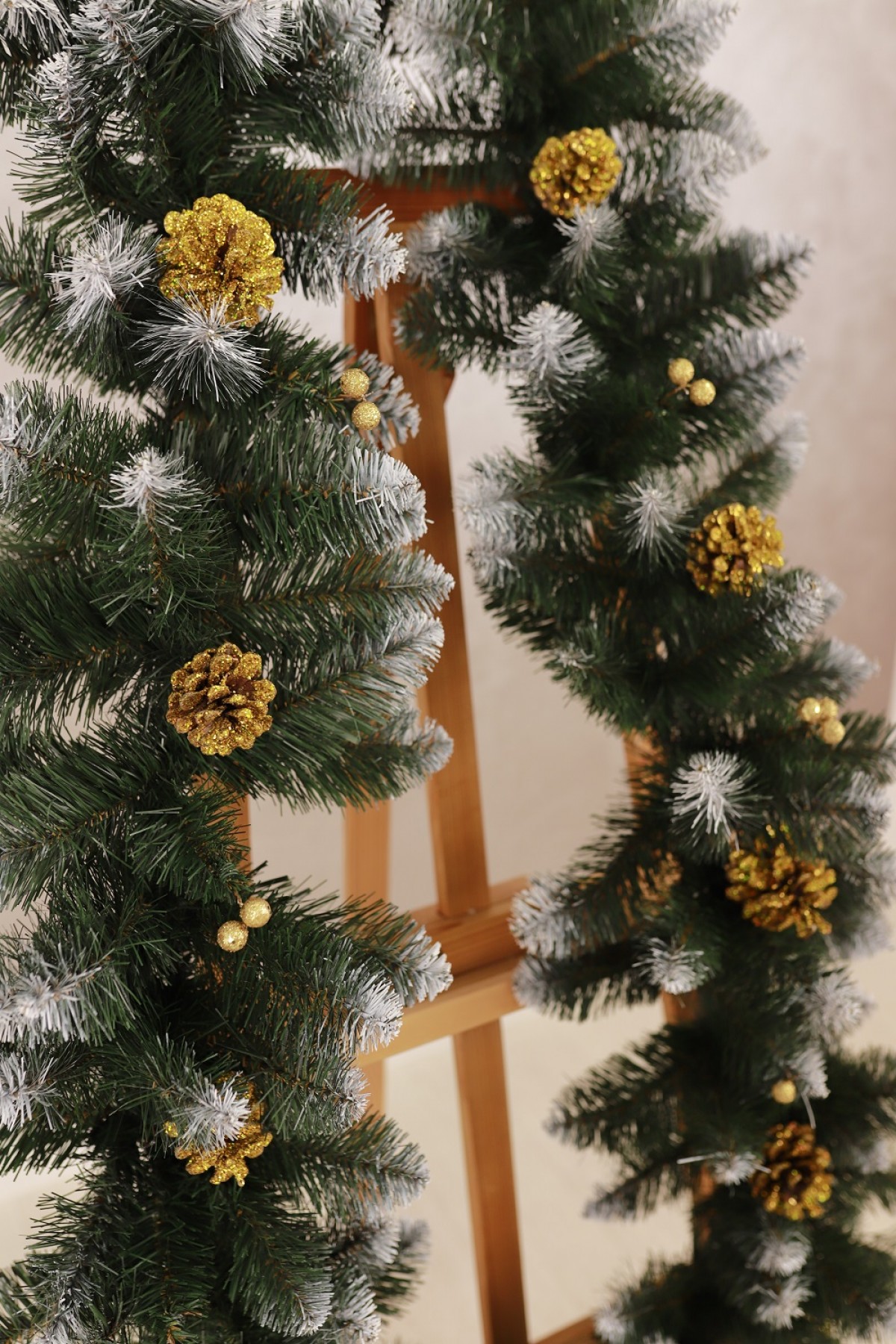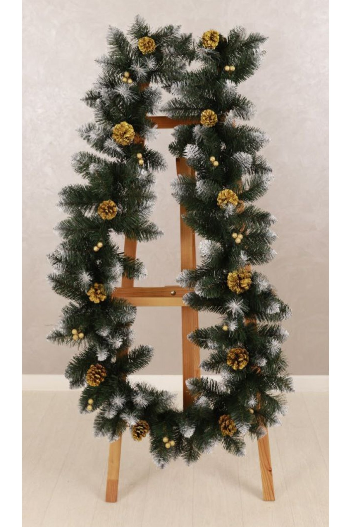 Різдвяна гірлянда з шишками та калиною призначена для прикраси будинку, квартири, офісу, салону, кабінету, або іншого простору напередодні зимових свят. Гірлянду розміщують в отворі дверей, вікон, на каміні, перилах, а також інших поверхнях. Новорічний аксесуар виготовлений з якісної штучної хвої насиченого зеленого кольору та білими кінчиками. Гірлянда має довжину 2,8 метри, крона складається з 34 ярусів, а на кожному ярусі розташовані 4 гілочки.