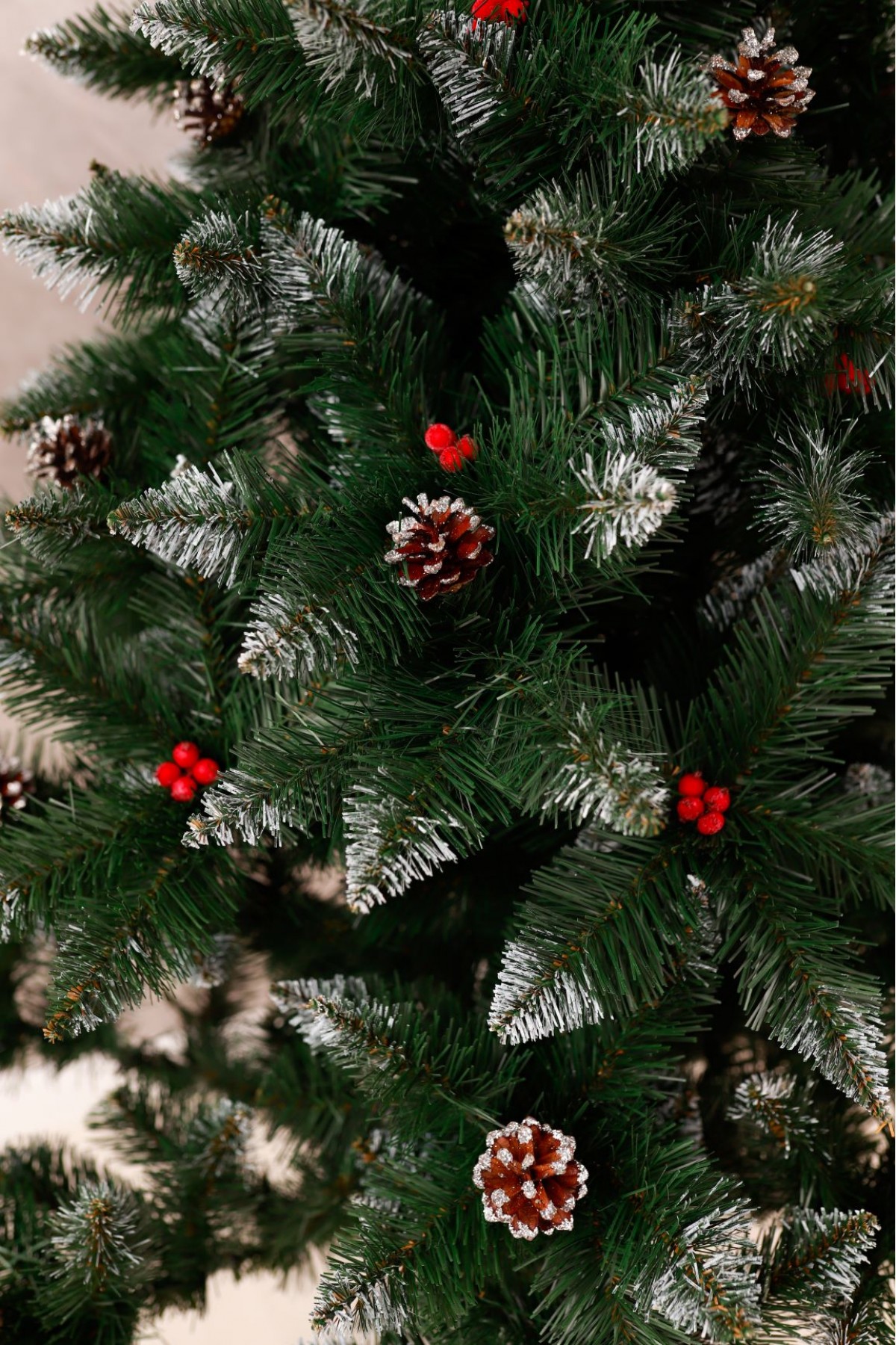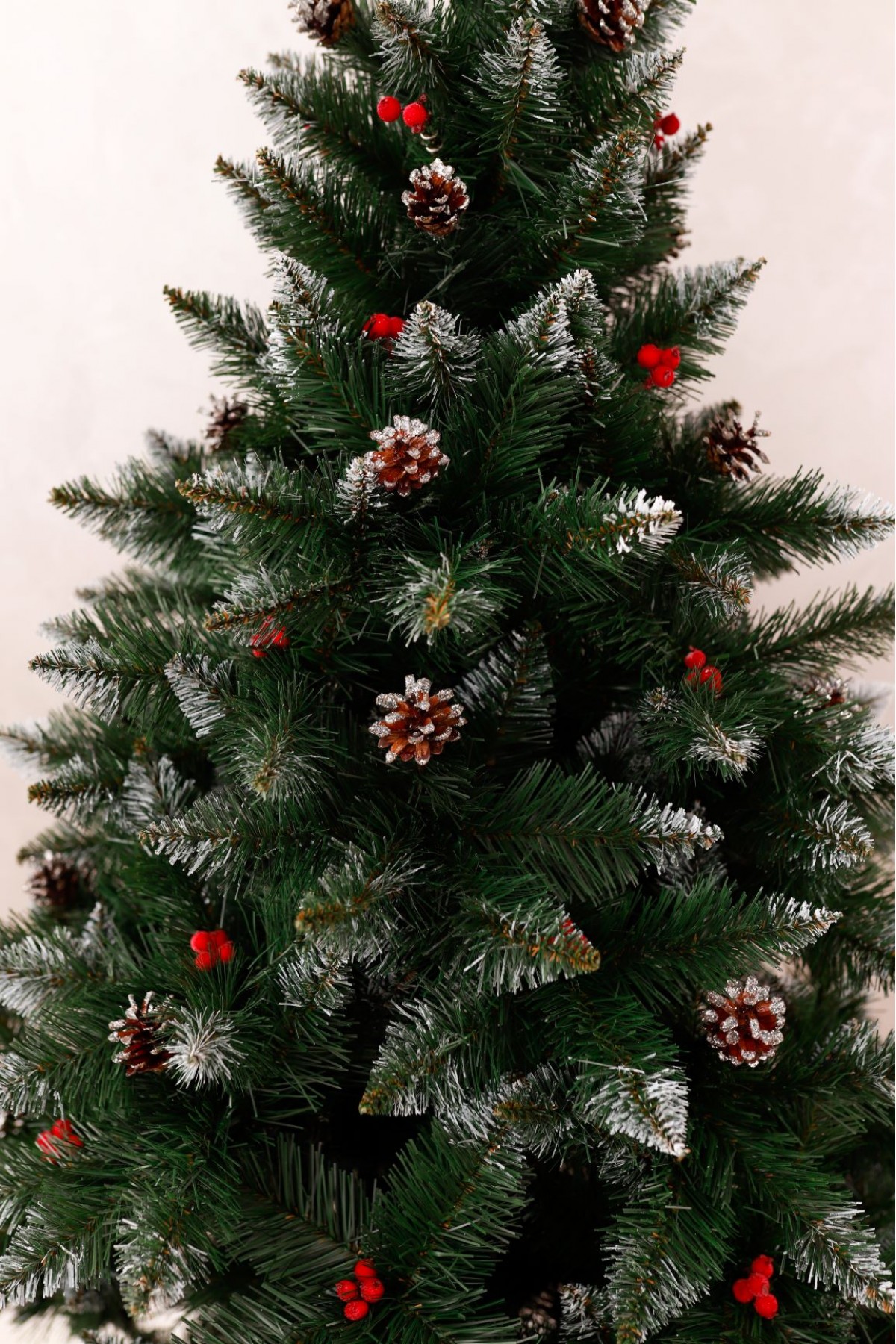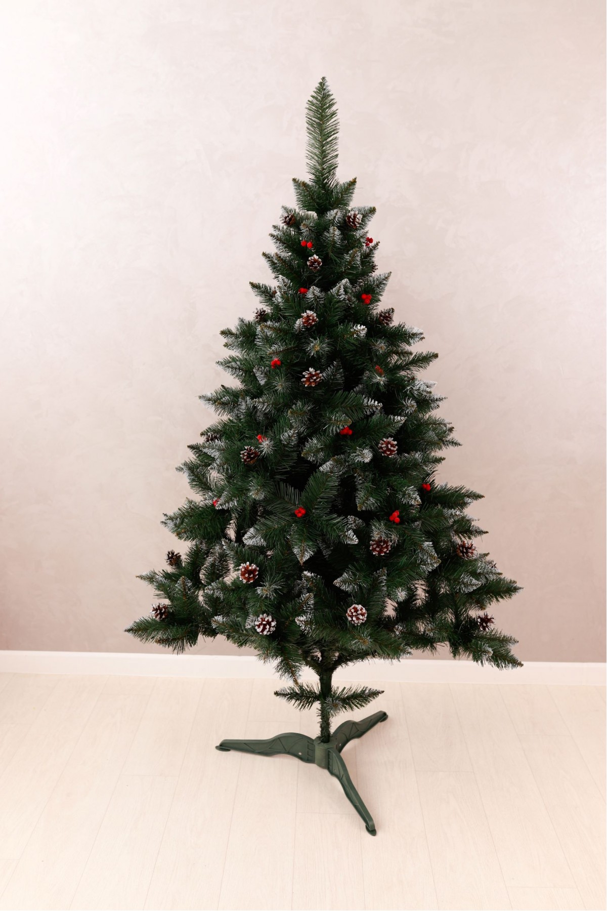 Ялина штучна Елітна з шишками та червоною калиною 1,8 м має пишну хвою насиченого зеленого кольору. Білосніжні кінчики легким шаром покривають гілки, додаючи ніжності та вишуканості цьому різдвяному дереву. На гілках розсипані шишки, що іскряться на світлі. Кожна шишка - це унікальний шедевр природи зі своїм малюнком і текстурою. Яскраві ягоди виділяються на тлі зелені, надаючи ялинці грайливості та жвавості. Цей елемент декору створює контраст між теплом відтінків і холодом зими, пробуджуючи почуття затишку і чарівництва. Ялинка має вигляд справжнього дерева завдяки сучасному підходу у виготовленні хвої з ПВХ матеріалів. Стовбур виконаний з металу, а каркас має дротяну основу, пластикова підставка зручна і стійка, легко розкладається і встановлюється. Модель упакована в компактний картонний ящик. Наші ялинки відповідають стандартам якості, довговічні в експлуатації, гіпоалергенні, безпечні, не схильні до загоряння, прості в установці та зберіганні.