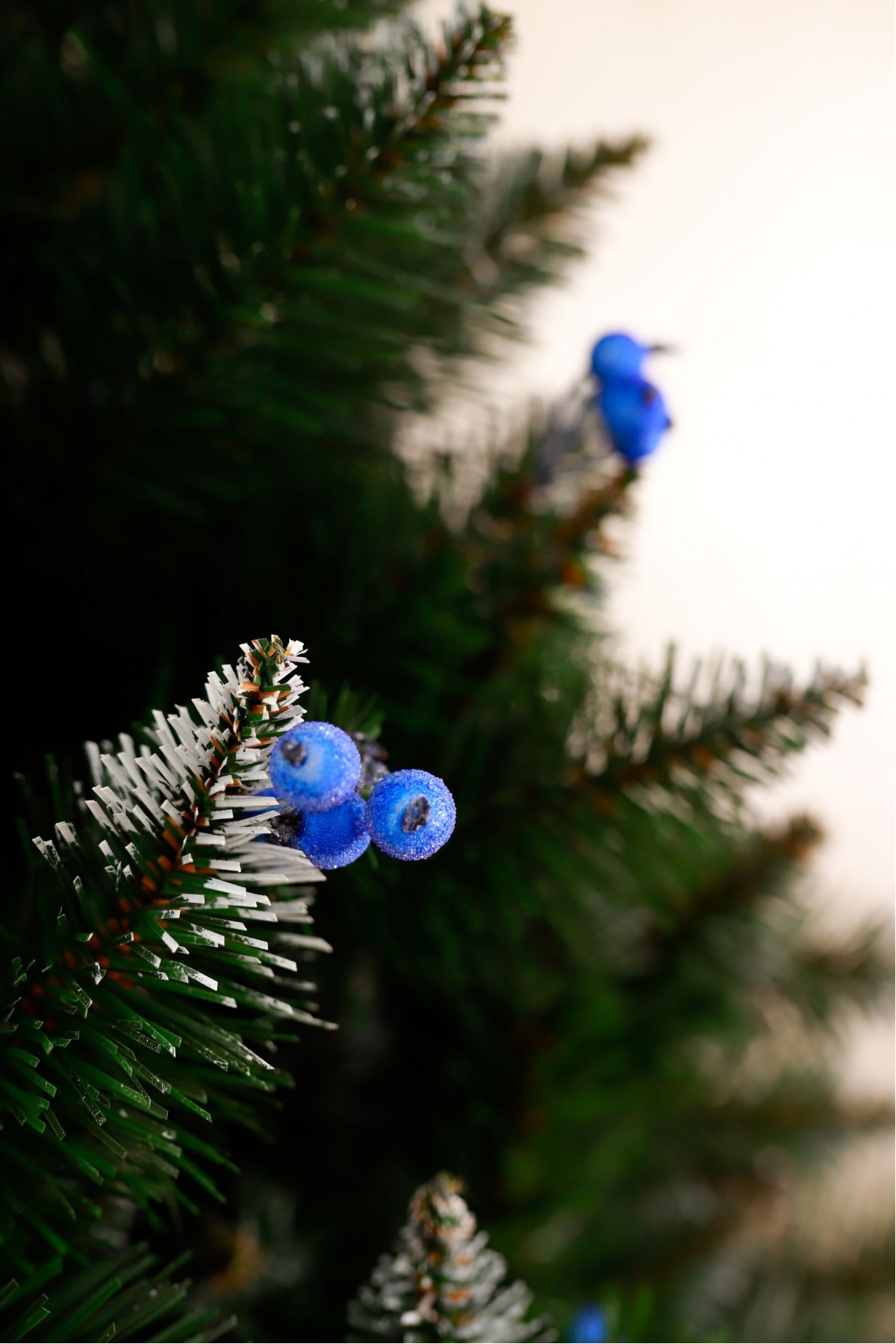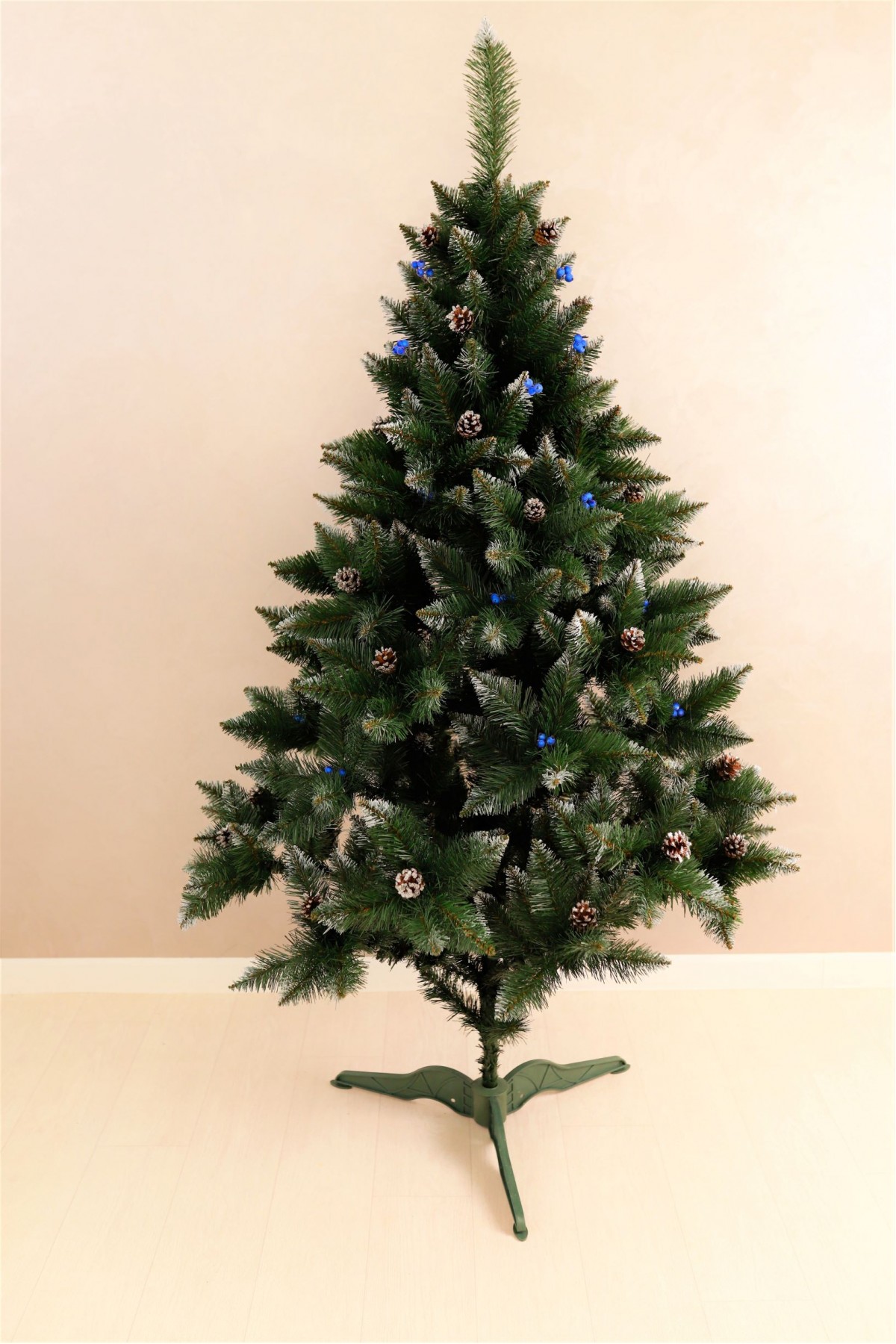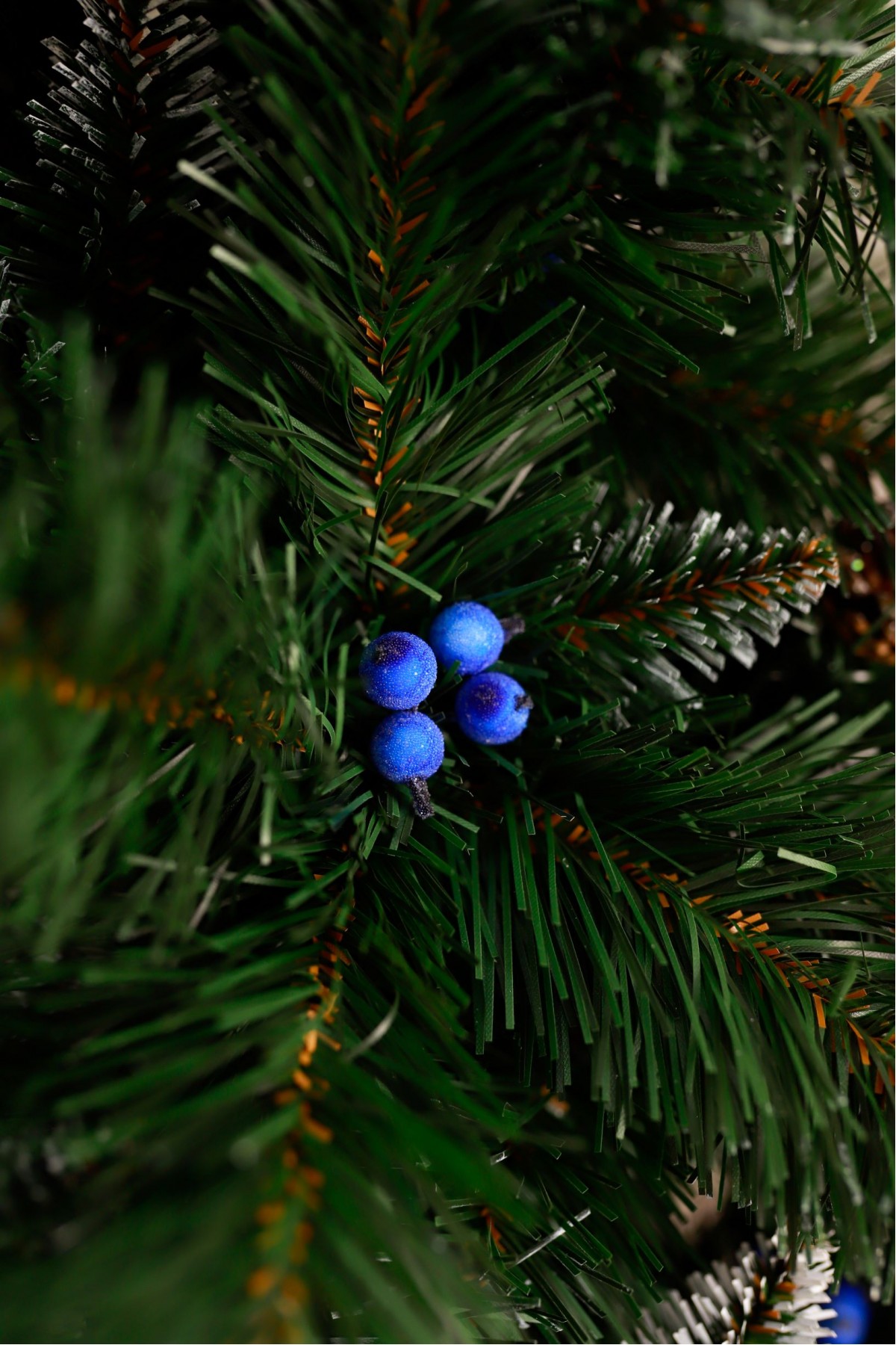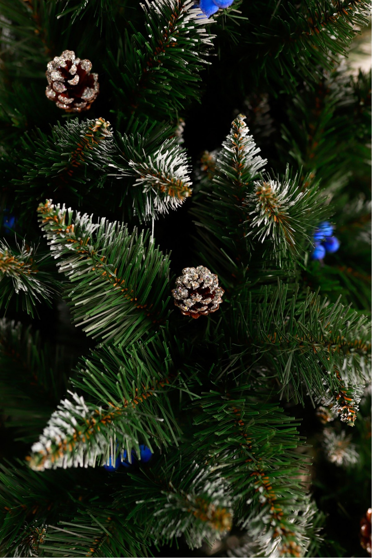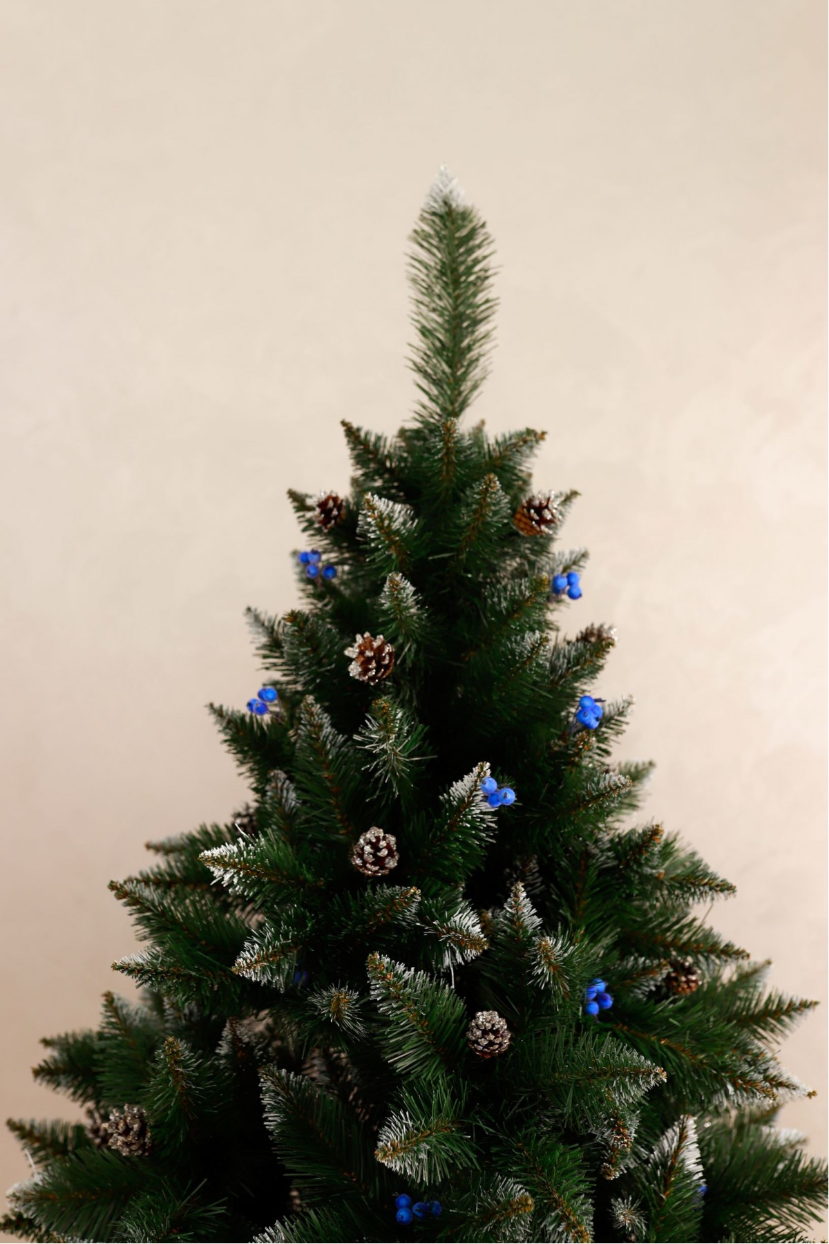 Ялина штучна Елітна з шишками та синьою калиною 1,8 м має пишну хвою насиченого зеленого кольору. Білосніжні кінчики легким шаром покривають гілки, додаючи ніжності та вишуканості цьому різдвяному дереву. На гілках розсипані шишки, що іскряться на світлі. Кожна шишка - це унікальний шедевр природи зі своїм малюнком і текстурою. Яскраві ягоди виділяються на тлі зелені, надаючи ялинці грайливості та жвавості. Цей елемент декору створює контраст між теплом відтінків і холодом зими, пробуджуючи почуття затишку і чарівництва. Ялинка має вигляд справжнього дерева завдяки сучасному підходу у виготовленні хвої з ПВХ матеріалів. Стовбур виконаний з металу, а каркас має дротяну основу, пластикова підставка зручна і стійка, легко розкладається і встановлюється. Модель упакована в компактний картонний ящик. Наші ялинки відповідають стандартам якості, довговічні в експлуатації, гіпоалергенні, безпечні, не схильні до загоряння, прості в установці та зберіганні.