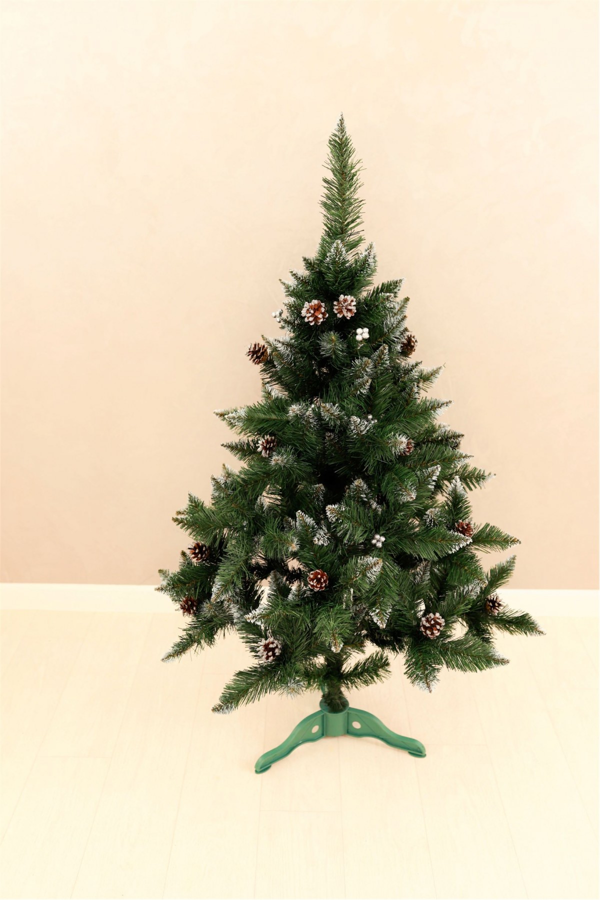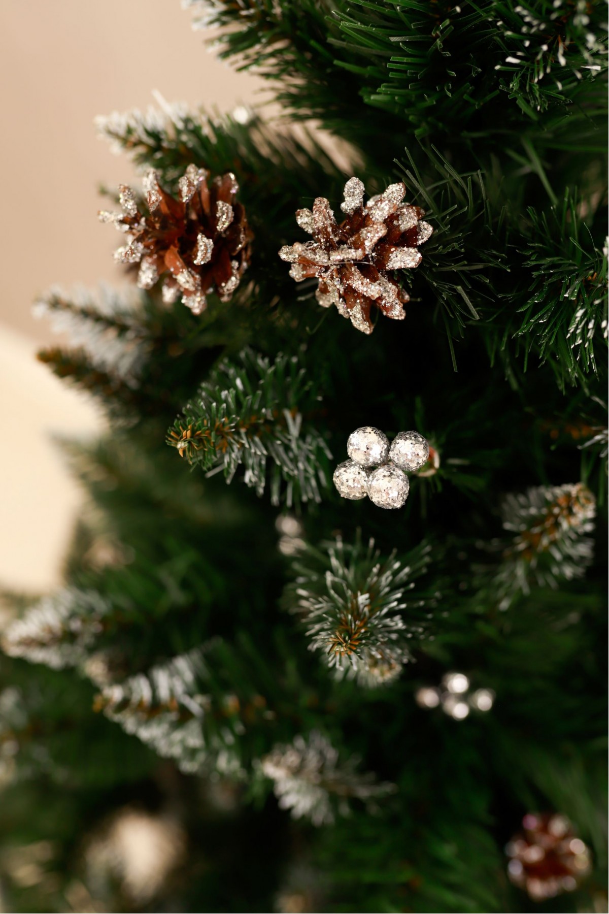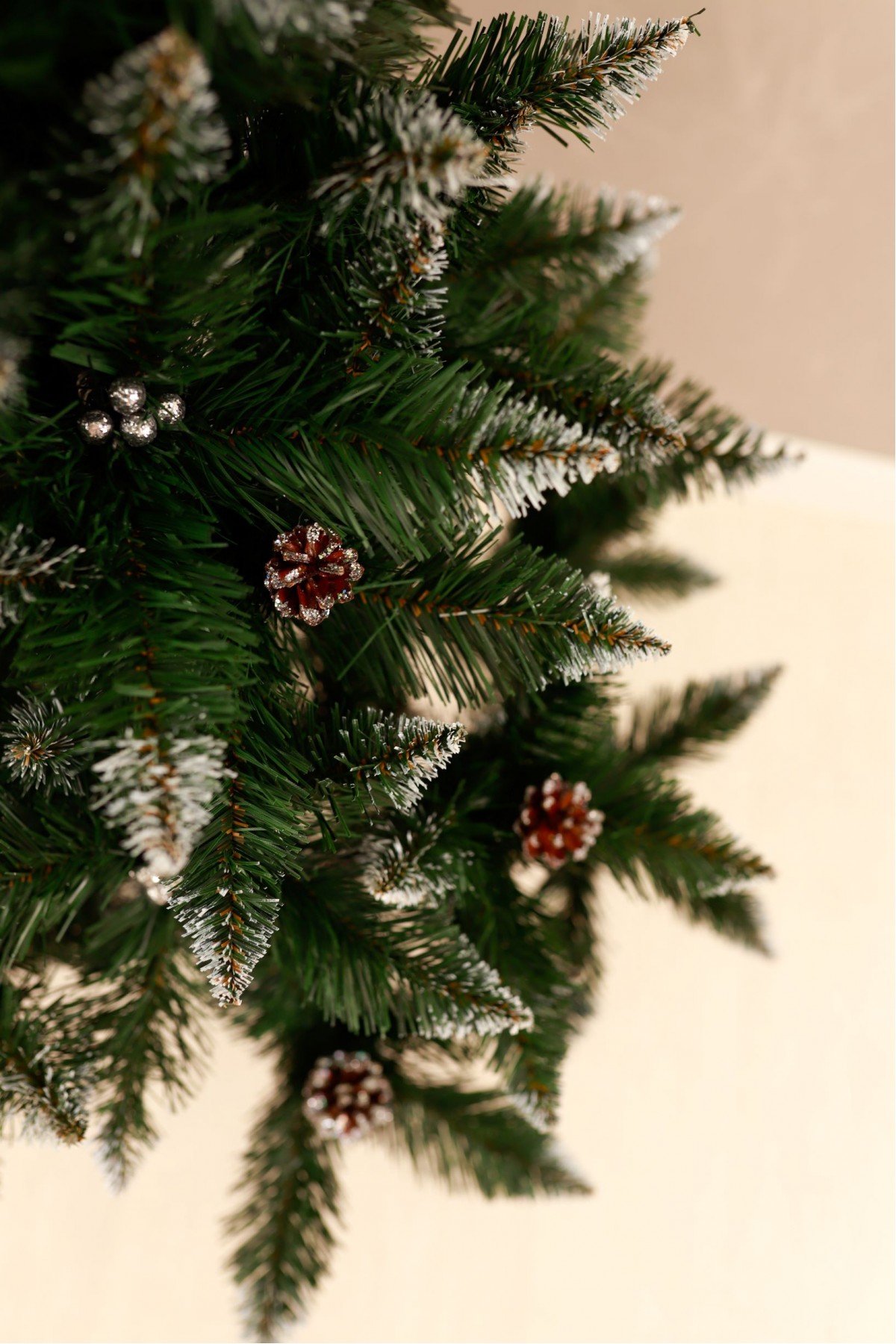 Ялина штучна Елітна з шишками та срібною калиною 1,3 м має пишну хвою насиченого зеленого кольору. Білосніжні кінчики легким шаром покривають гілки, додаючи ніжності та вишуканості цьому різдвяному дереву. На гілках розсипані шишки, що іскряться на світлі. Кожна шишка - це унікальний шедевр природи зі своїм малюнком і текстурою. Яскраві ягоди виділяються на тлі зелені, надаючи ялинці грайливості та жвавості. Цей елемент декору створює контраст між теплом відтінків і холодом зими, пробуджуючи почуття затишку і чарівництва. Ялинка має вигляд справжнього дерева завдяки сучасному підходу у виготовленні хвої з ПВХ матеріалів. Стовбур виконаний з металу, а каркас має дротяну основу, пластикова підставка зручна і стійка, легко розкладається і встановлюється. Модель упакована в компактний картонний ящик. Наші ялинки відповідають стандартам якості, довговічні в експлуатації, гіпоалергенні, безпечні, не схильні до загоряння, прості в установці та зберіганні.