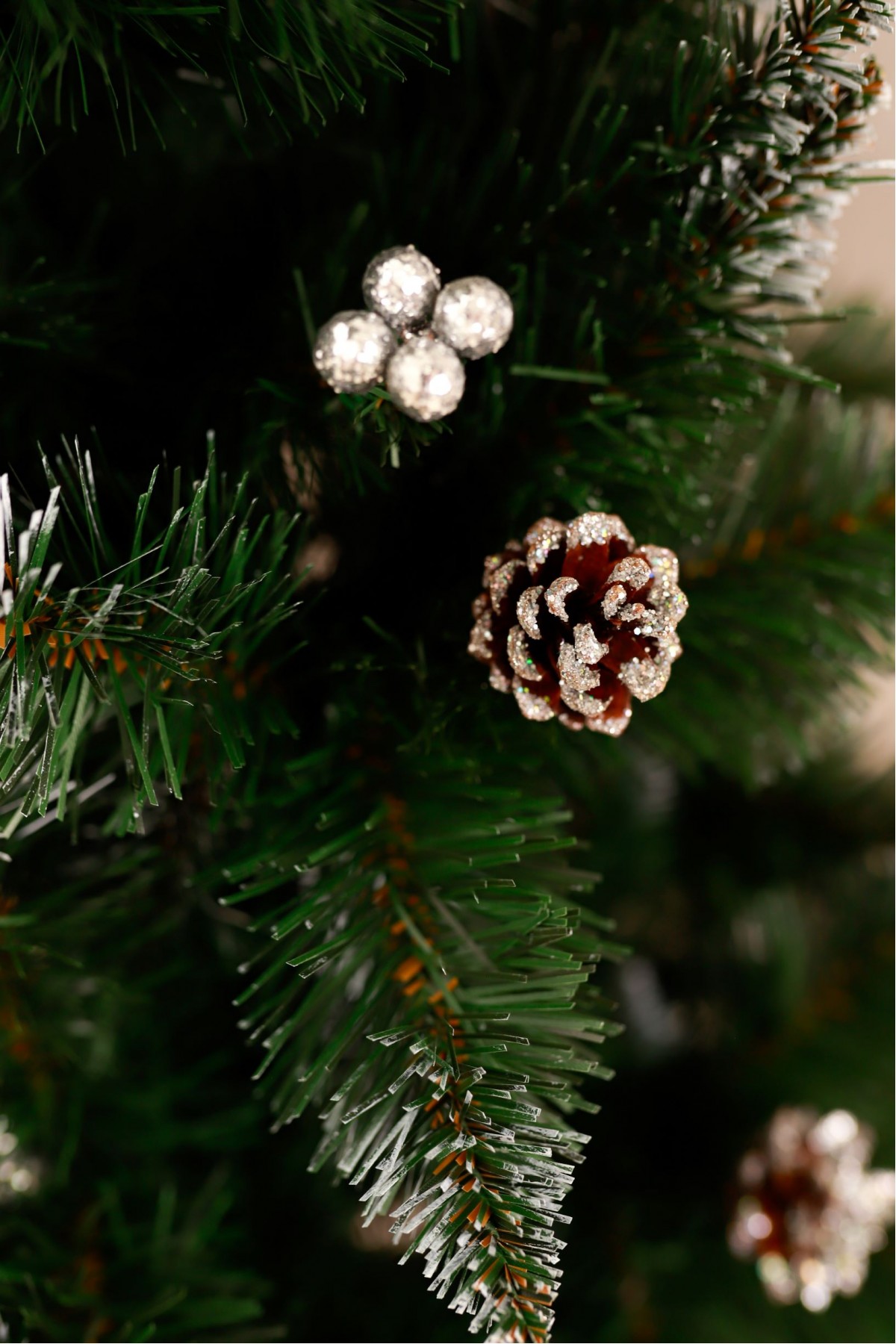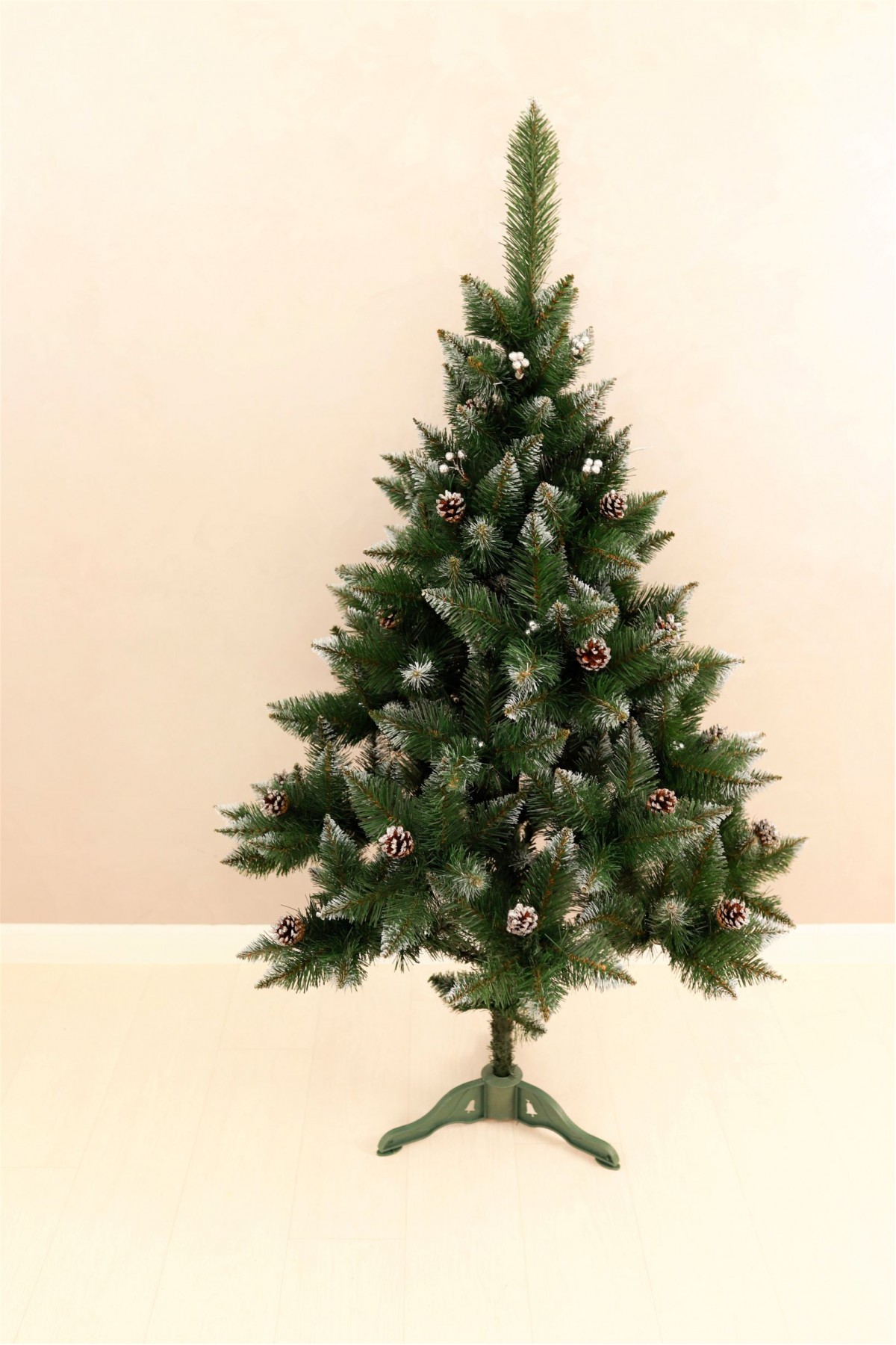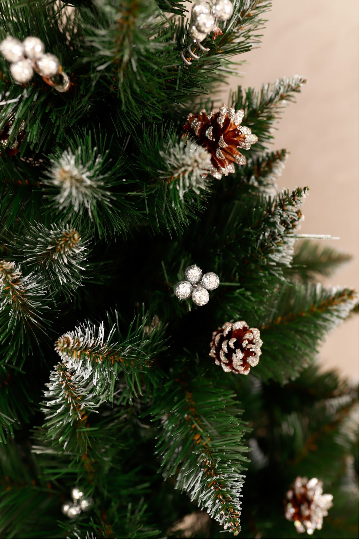 Ялина штучна Елітна з шишками та срібною калиною 1,5 м має пишну хвою насиченого зеленого кольору. Білосніжні кінчики легким шаром покривають гілки, додаючи ніжності та вишуканості цьому різдвяному дереву. На гілках розсипані шишки, що іскряться на світлі. Кожна шишка - це унікальний шедевр природи зі своїм малюнком і текстурою. Яскраві ягоди виділяються на тлі зелені, надаючи ялинці грайливості та жвавості. Цей елемент декору створює контраст між теплом відтінків і холодом зими, пробуджуючи почуття затишку і чарівництва. Ялинка має вигляд справжнього дерева завдяки сучасному підходу у виготовленні хвої з ПВХ матеріалів. Стовбур виконаний з металу, а каркас має дротяну основу, пластикова підставка зручна і стійка, легко розкладається і встановлюється. Модель упакована в компактний картонний ящик. Наші ялинки відповідають стандартам якості, довговічні в експлуатації, гіпоалергенні, безпечні, не схильні до загоряння, прості в установці та зберіганні.