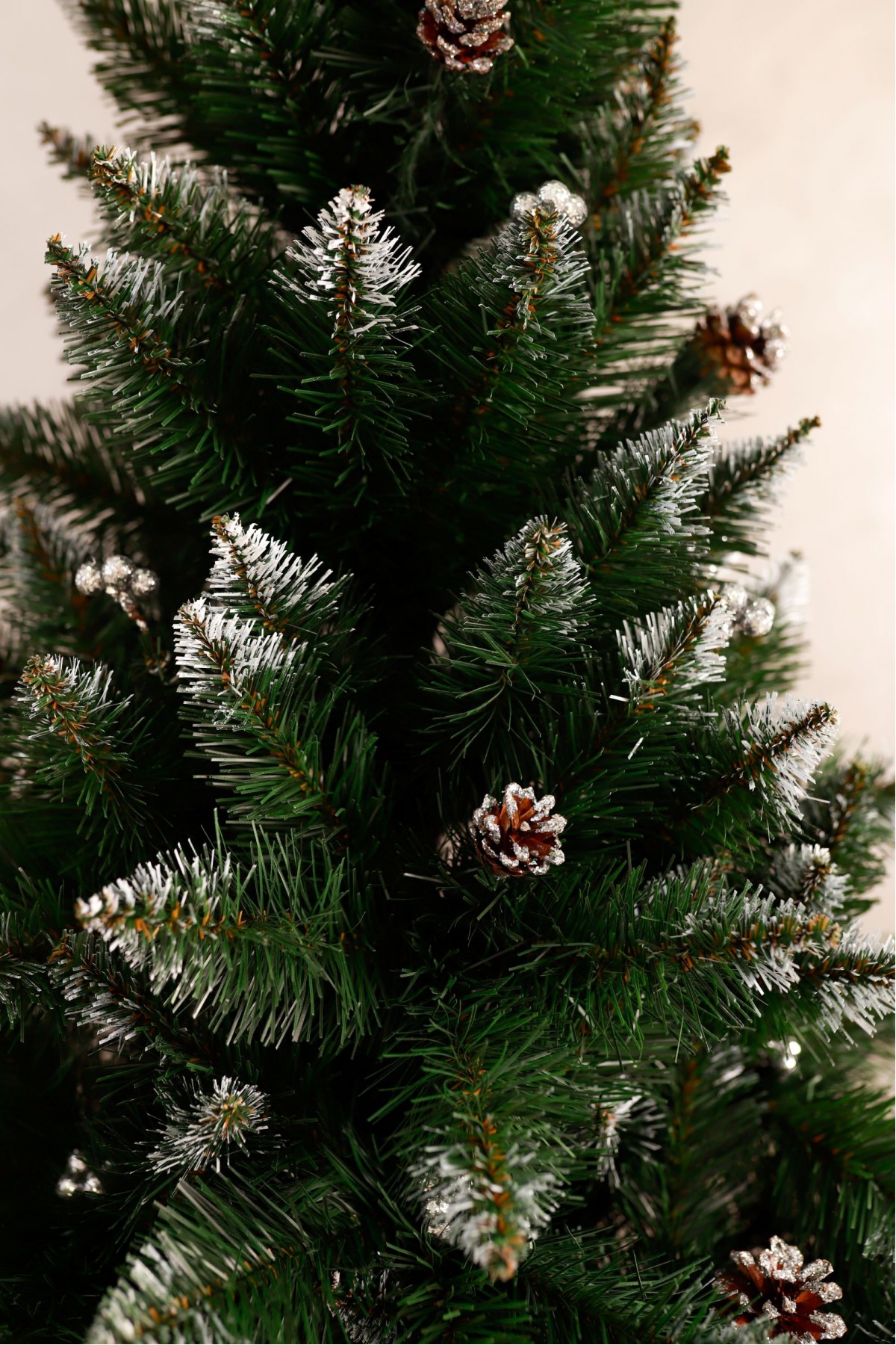 Ялина штучна Елітна з шишками та срібною калиною 2,0 м має пишну хвою насиченого зеленого кольору. Білосніжні кінчики легким шаром покривають гілки, додаючи ніжності та вишуканості цьому різдвяному дереву. На гілках розсипані шишки, що іскряться на світлі. Кожна шишка - це унікальний шедевр природи зі своїм малюнком і текстурою. Яскраві ягоди виділяються на тлі зелені, надаючи ялинці грайливості та жвавості. Цей елемент декору створює контраст між теплом відтінків і холодом зими, пробуджуючи почуття затишку і чарівництва. Ялинка має вигляд справжнього дерева завдяки сучасному підходу у виготовленні хвої з ПВХ матеріалів. Стовбур виконаний з металу, а каркас має дротяну основу, пластикова підставка зручна і стійка, легко розкладається і встановлюється. Модель упакована в компактний картонний ящик. Наші ялинки відповідають стандартам якості, довговічні в експлуатації, гіпоалергенні, безпечні, не схильні до загоряння, прості в установці та зберіганні.