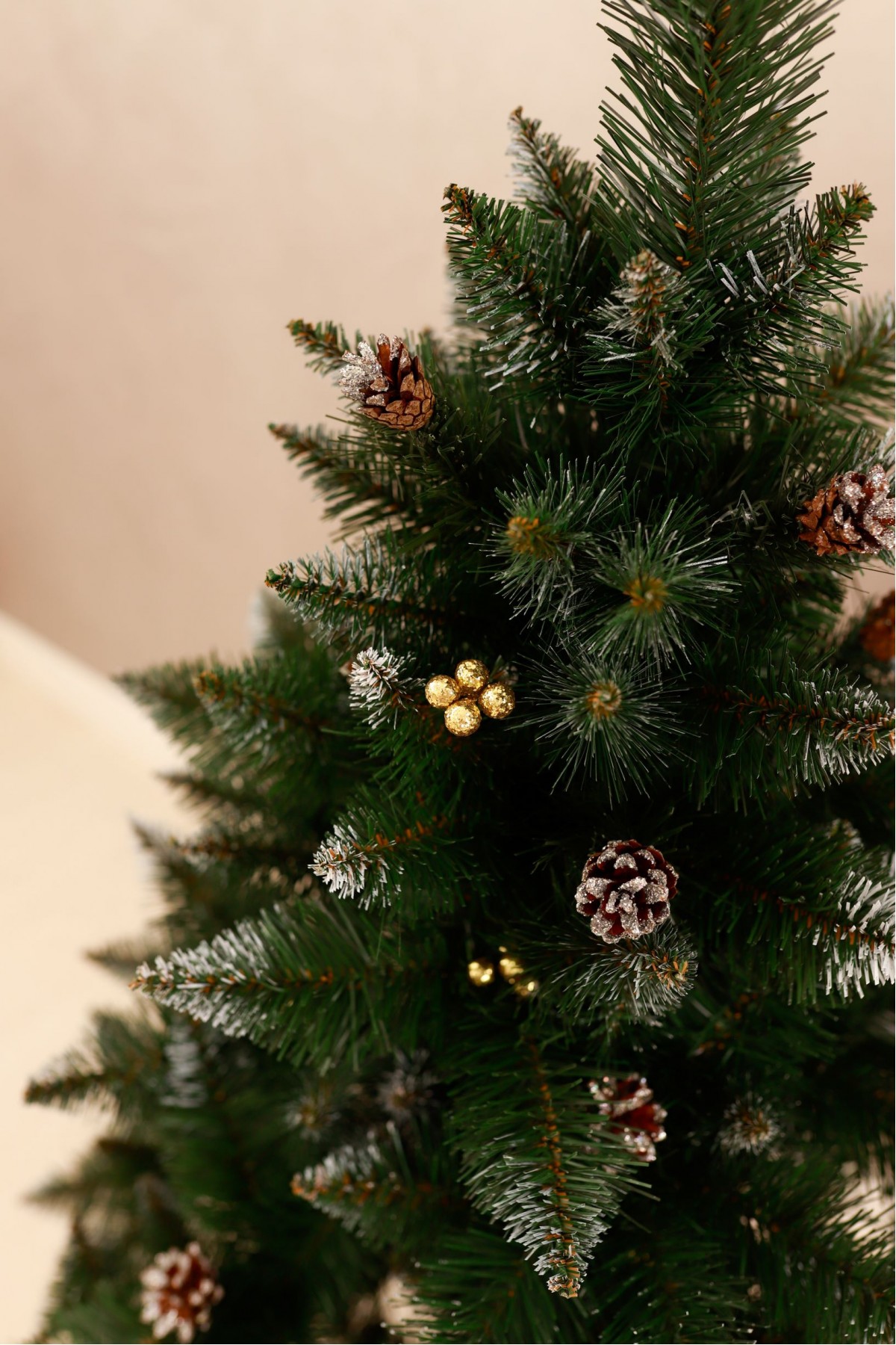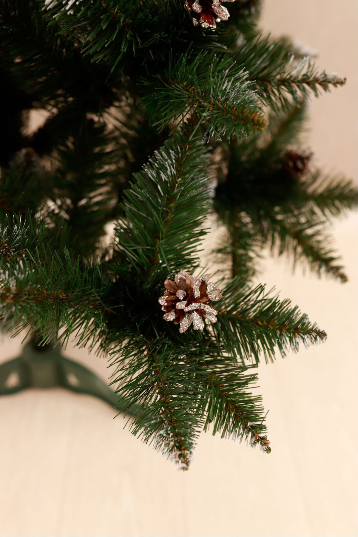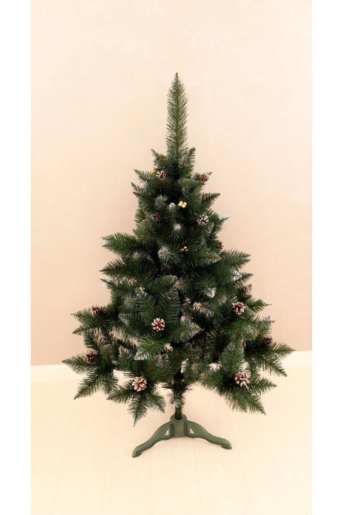 Ялина штучна Елітна з шишками та золотою калиною 1,3 м має пишну хвою насиченого зеленого кольору. Білосніжні кінчики легким шаром покривають гілки, додаючи ніжності та вишуканості цьому різдвяному дереву. На гілках розсипані шишки, що іскряться на світлі. Кожна шишка - це унікальний шедевр природи зі своїм малюнком і текстурою. Яскраві ягоди виділяються на тлі зелені, надаючи ялинці грайливості та жвавості. Цей елемент декору створює контраст між теплом відтінків і холодом зими, пробуджуючи почуття затишку і чарівництва. Ялинка має вигляд справжнього дерева завдяки сучасному підходу у виготовленні хвої з ПВХ матеріалів. Стовбур виконаний з металу, а каркас має дротяну основу, пластикова підставка зручна і стійка, легко розкладається і встановлюється. Модель упакована в компактний картонний ящик. Наші ялинки відповідають стандартам якості, довговічні в експлуатації, гіпоалергенні, безпечні, не схильні до загоряння, прості в установці та зберіганні.