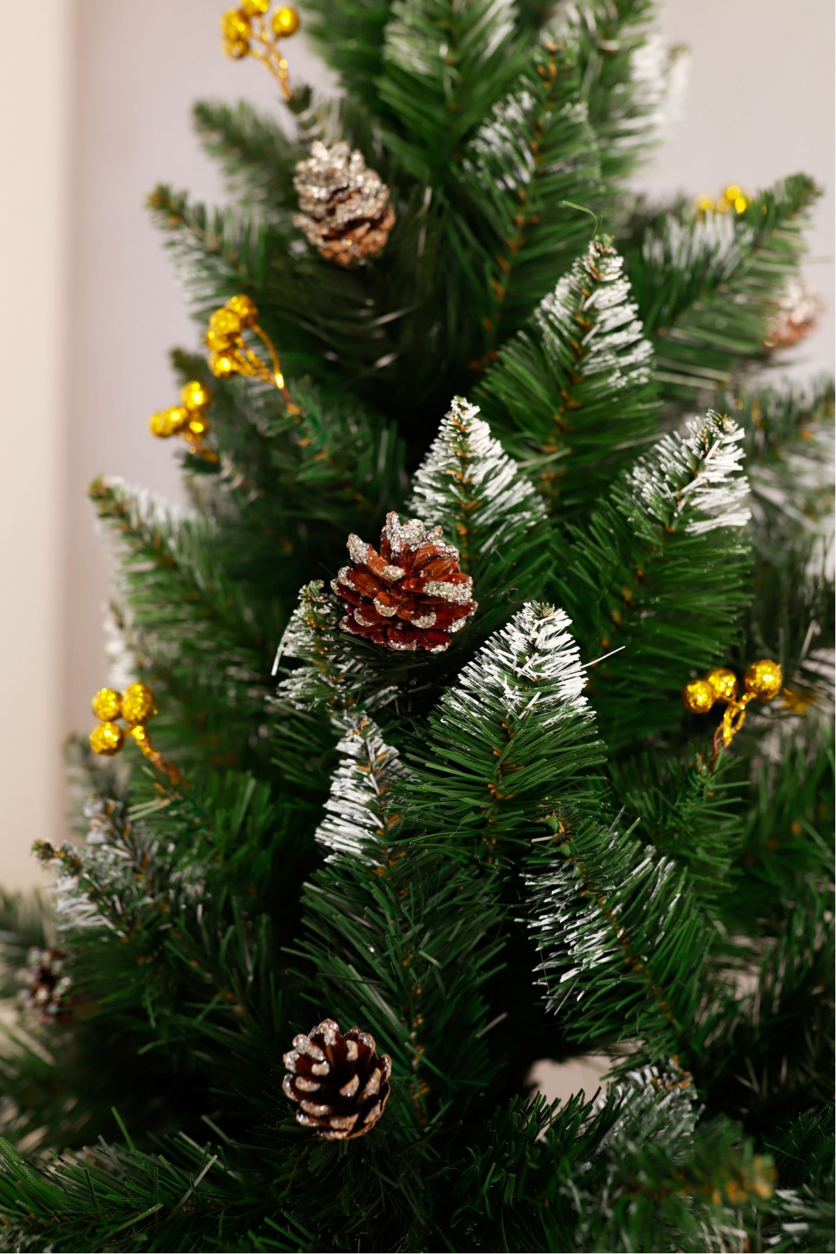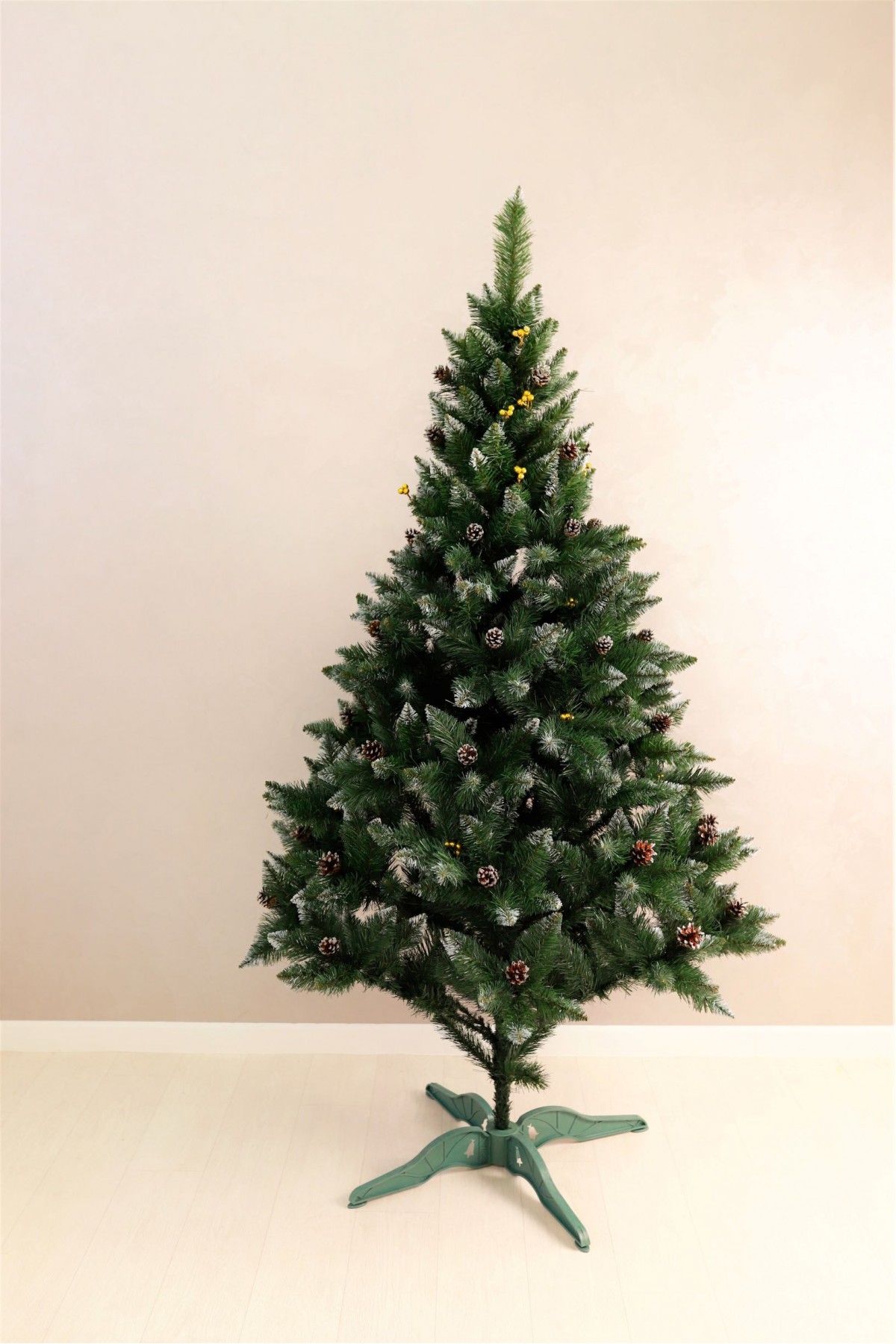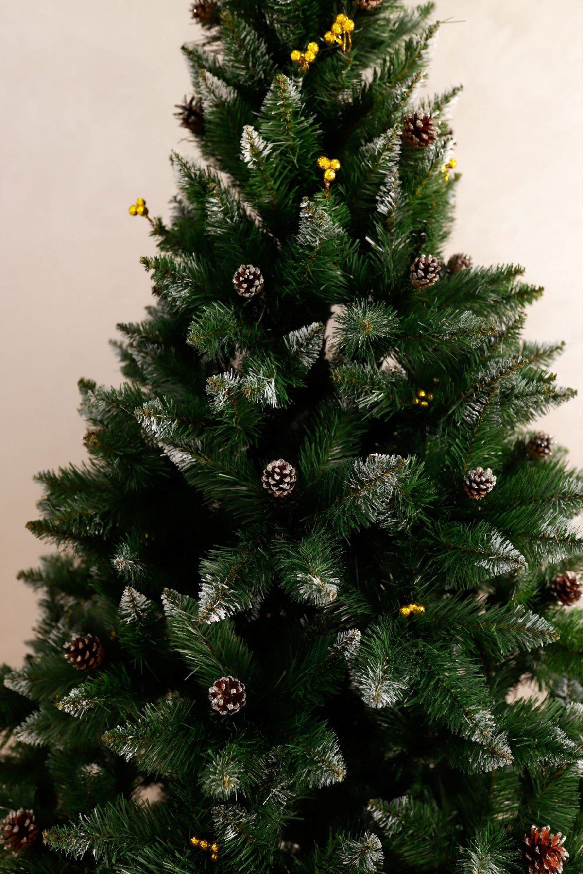 Ялина штучна Елітна з шишками та золотою калиною 2,0 м має пишну хвою насиченого зеленого кольору. Білосніжні кінчики легким шаром покривають гілки, додаючи ніжності та вишуканості цьому різдвяному дереву. На гілках розсипані шишки, що іскряться на світлі. Кожна шишка - це унікальний шедевр природи зі своїм малюнком і текстурою. Яскраві ягоди виділяються на тлі зелені, надаючи ялинці грайливості та жвавості. Цей елемент декору створює контраст між теплом відтінків і холодом зими, пробуджуючи почуття затишку і чарівництва. Ялинка має вигляд справжнього дерева завдяки сучасному підходу у виготовленні хвої з ПВХ матеріалів. Стовбур виконаний з металу, а каркас має дротяну основу, пластикова підставка зручна і стійка, легко розкладається і встановлюється. Модель упакована в компактний картонний ящик. Наші ялинки відповідають стандартам якості, довговічні в експлуатації, гіпоалергенні, безпечні, не схильні до загоряння, прості в установці та зберіганні.