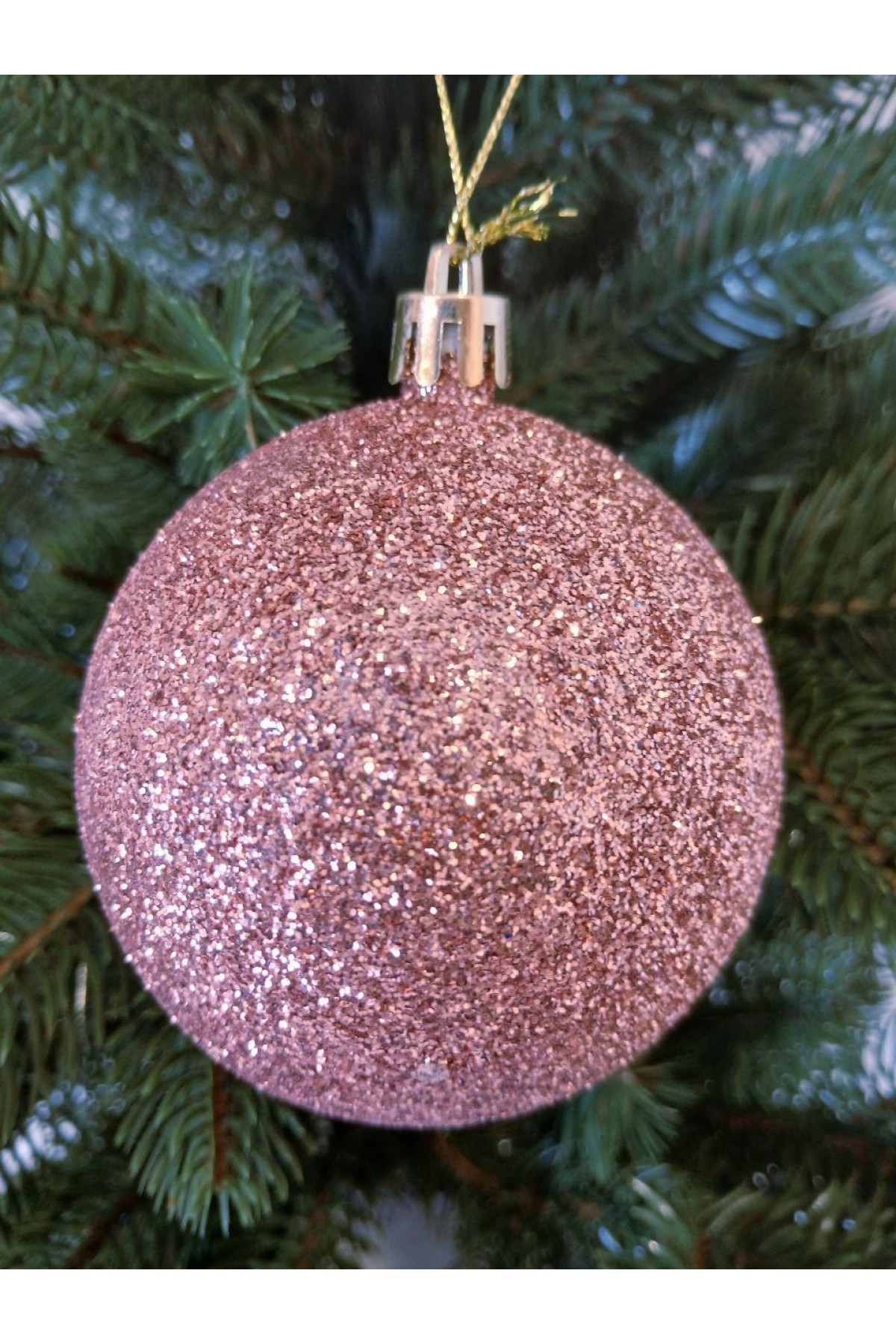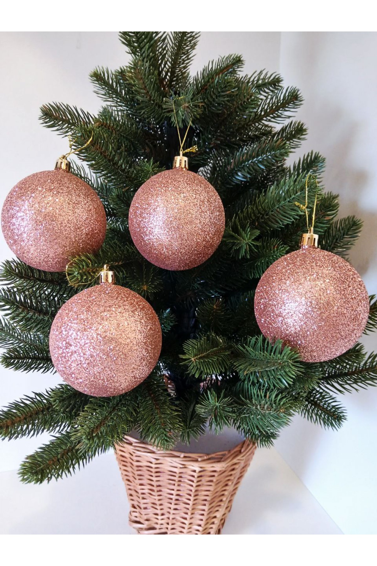 Набір ялинкових куль 8 см підійде для прикраси зелених, блакитних та засніжених ялинок розміром від 0,7 метра і вище. Кулі рожево-золотого кольору мають пластикову основу, декоровані глітером.