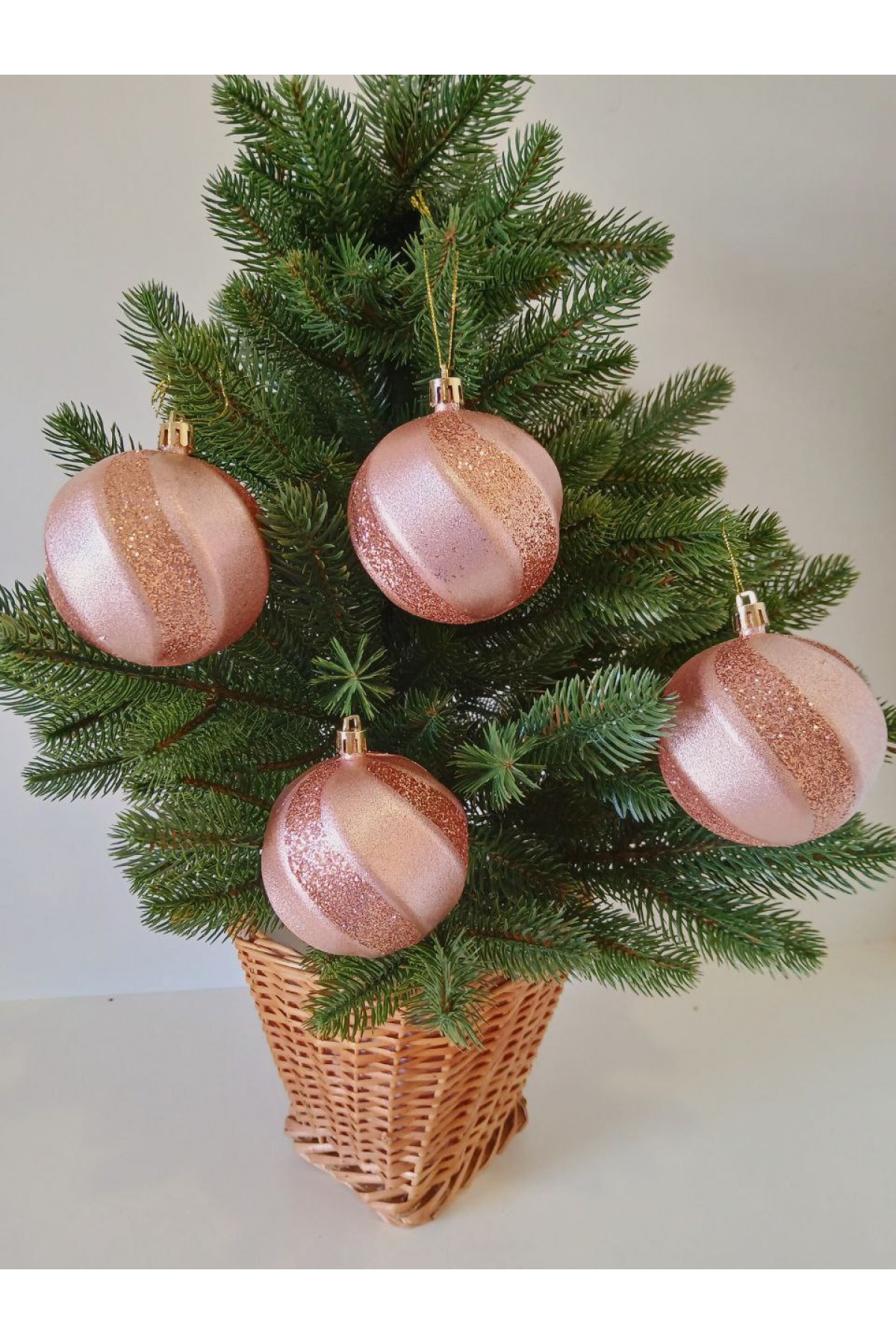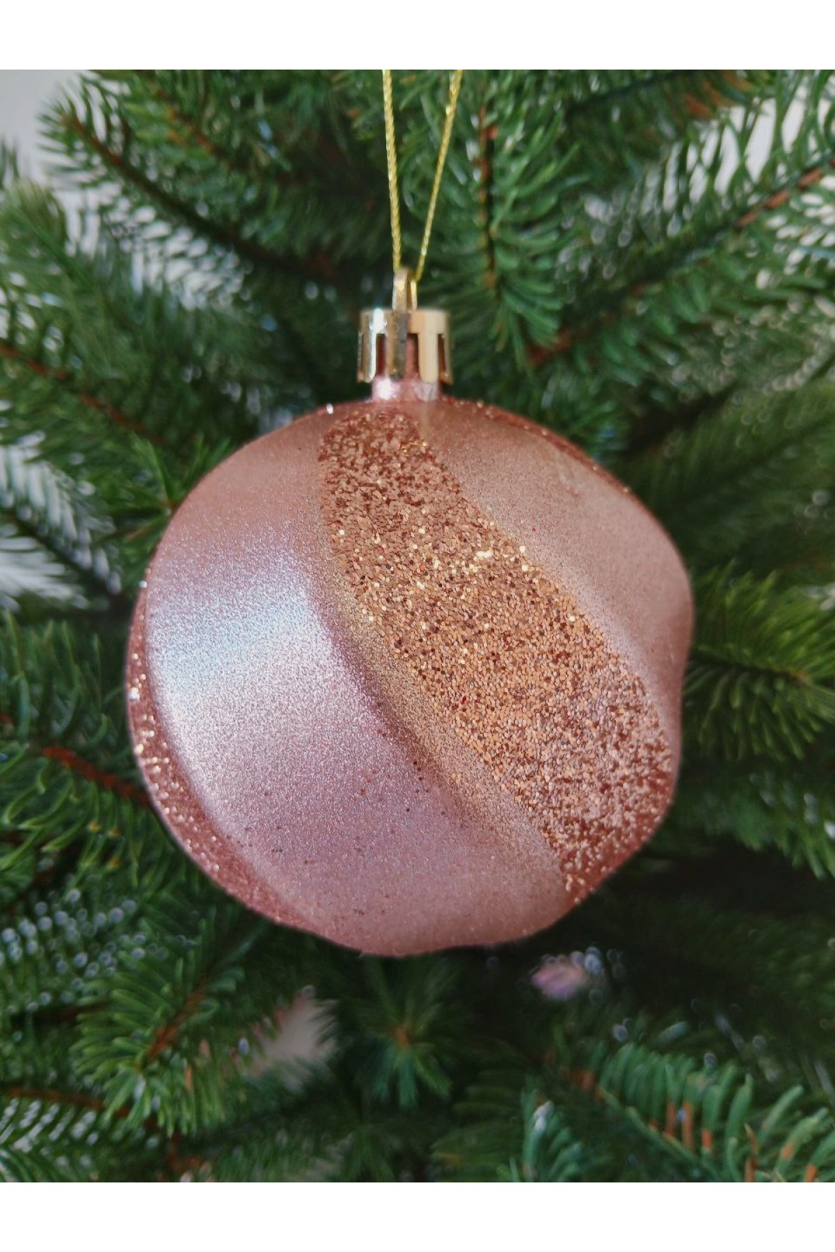 Набір ялинкових куль 8 см підійде для прикраси зелених, блакитних та засніжених ялинок розміром від 0,7 метра і вище. Кулі рожево-золотого кольору, мають пластикову основу, декоровані глітером.