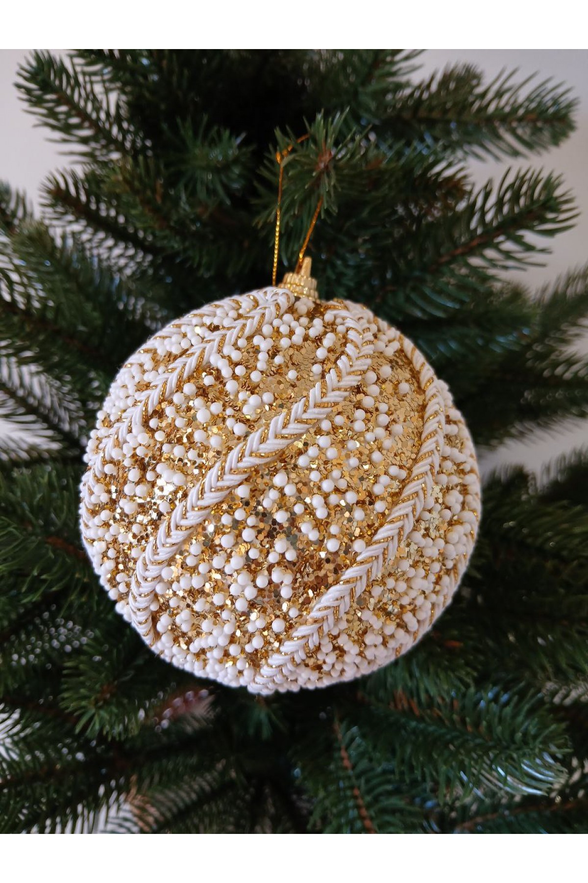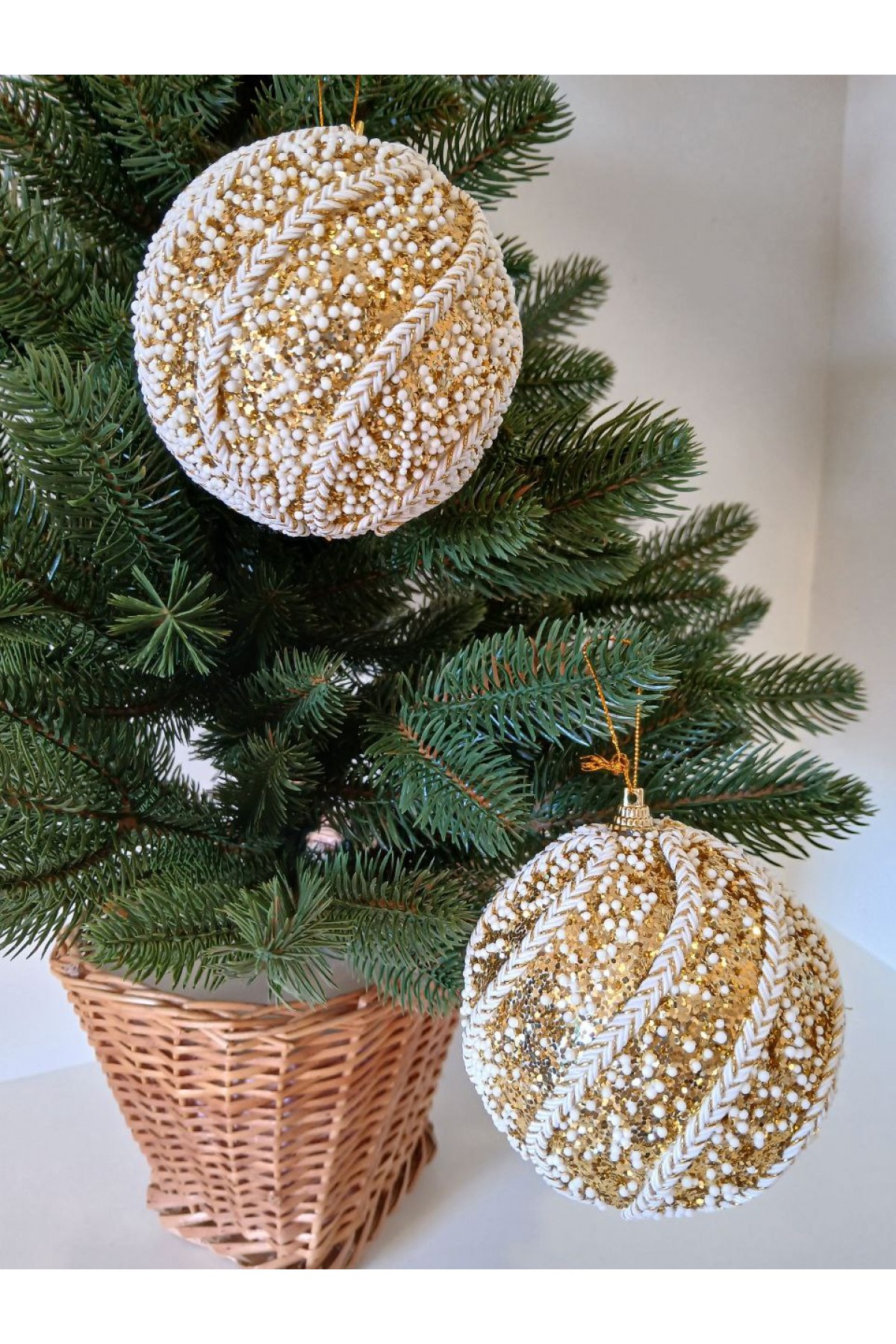 Набір ялинкових куль 10 см підійде для прикраси зелених, блакитних та засніжених ялинок розміром від 1,8 метра і вище. Кулі насиченого золотого відтінку, мають пластикову основу, вкриті блиском, сніговою крихтою, декоровані візерунком із текстилю.