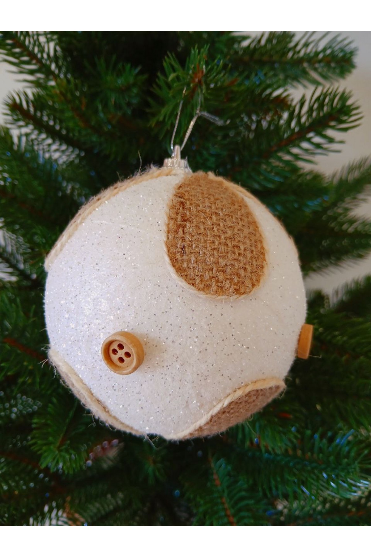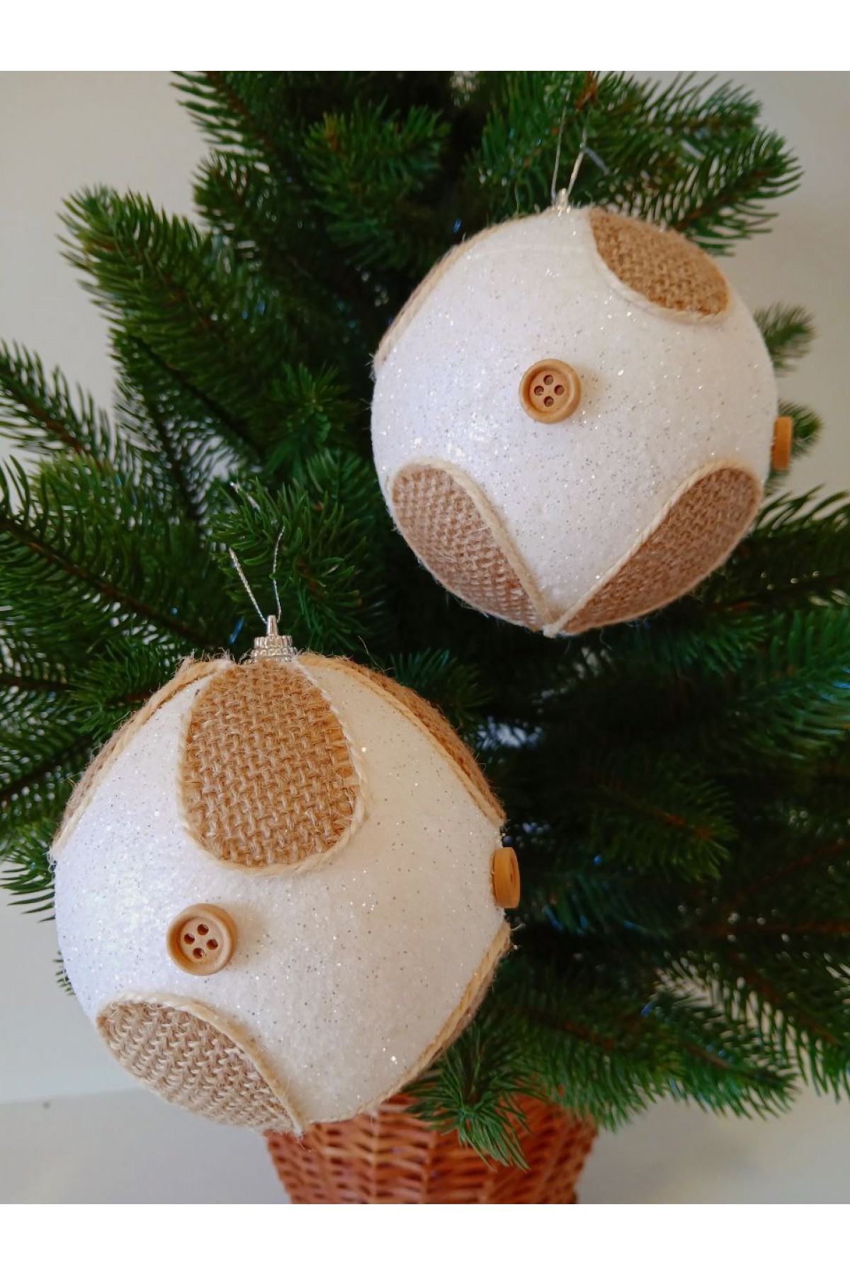 Набір ялинкових куль 10 см підійде для прикраси зелених, блакитних та засніжених ялинок розміром від 1,8 метра і вище. Кулі білого кольору, мають пластикову основу, декоровані текстилем та ґудзиками.