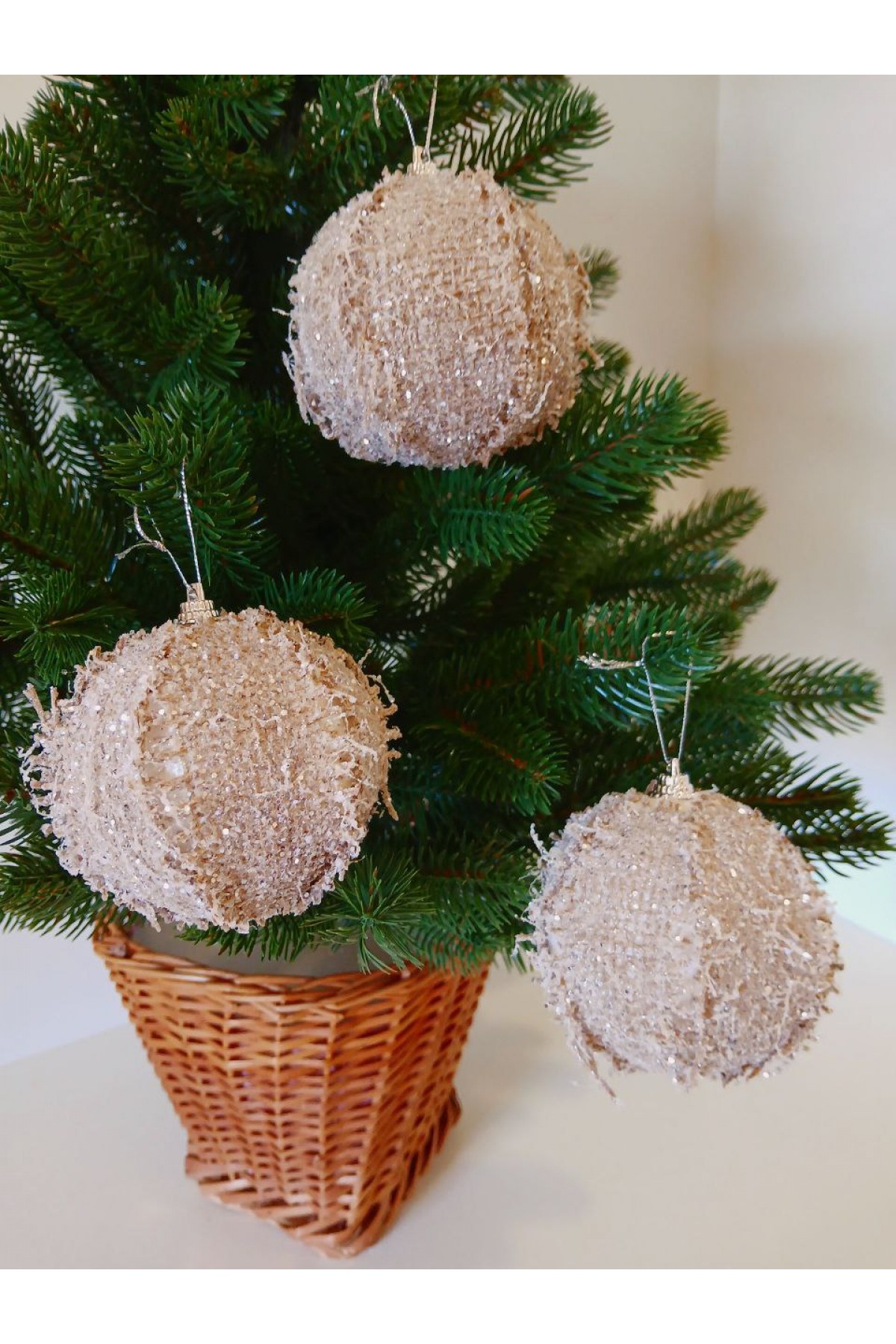 Набір ялинкових куль 8 см підійде для прикраси зелених, блакитних та засніжених ялинок розміром від 0,7 метра і вище. Кулі бежевого кольору мають пластикову основу, декоровані текстилем у стилі хенд мейд.