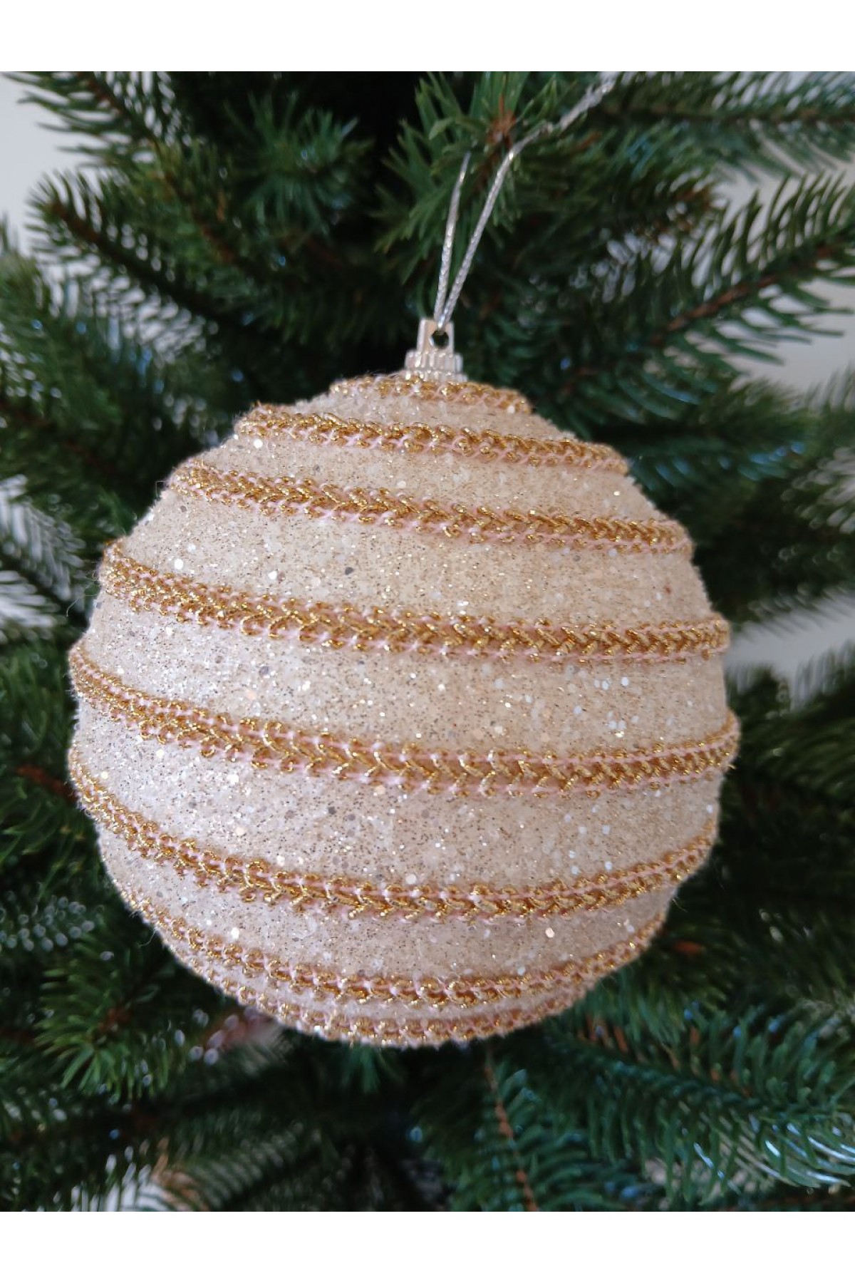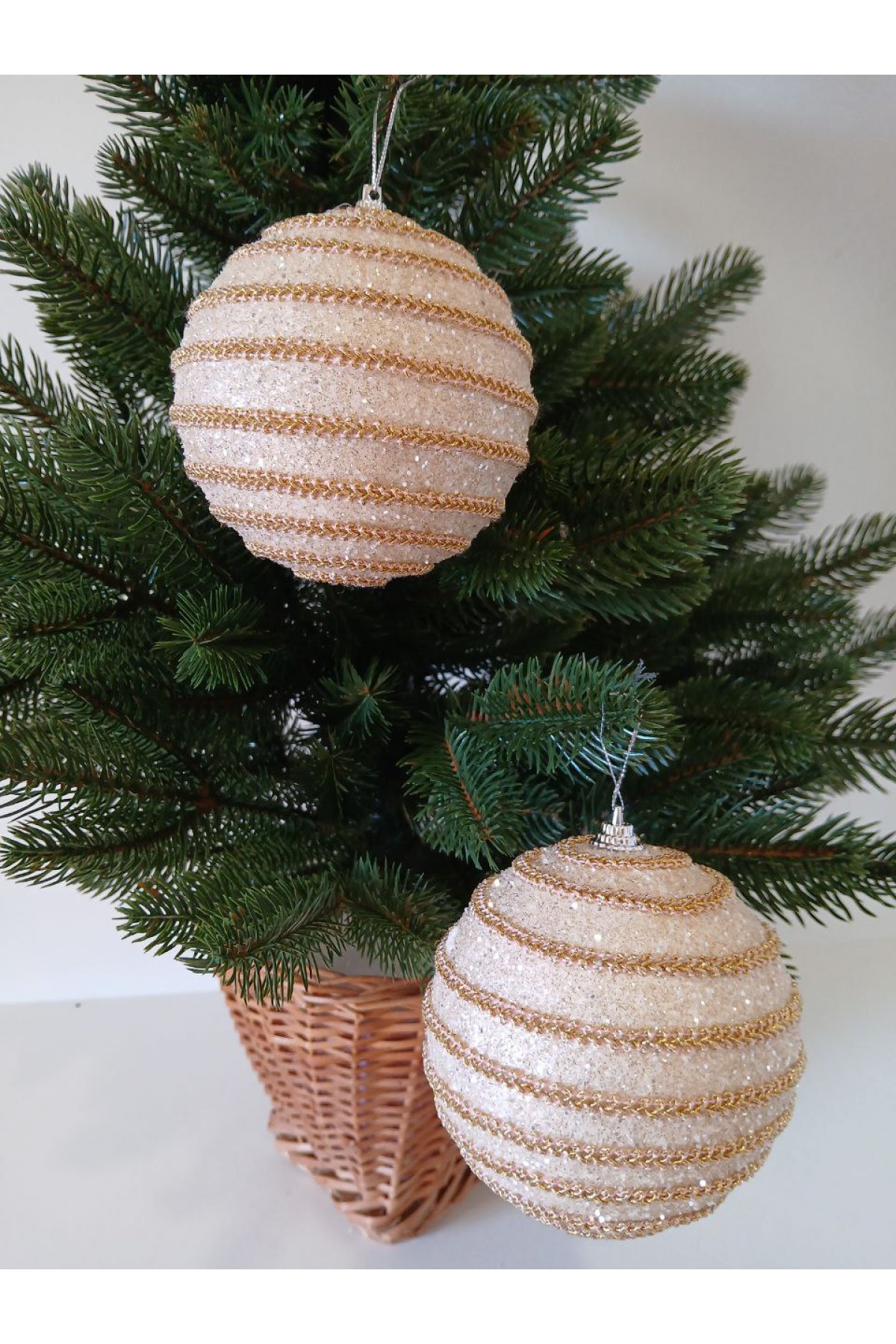 Набір ялинкових куль 10 см підійде для прикраси зелених, блакитних та засніжених ялинок розміром від 1,8 метра і вище. Кулі бежевого кольору, мають пластикову основу, декоровані золотою тасьмою та блиском.