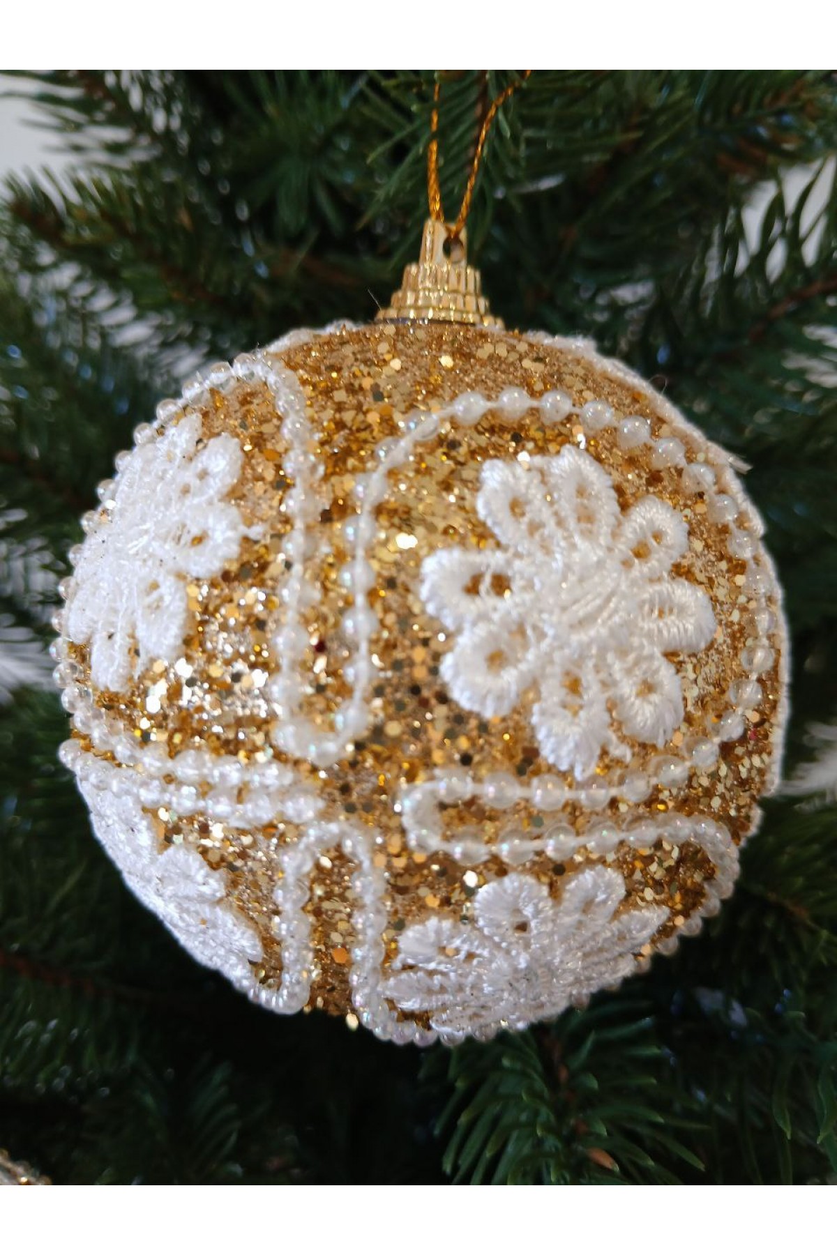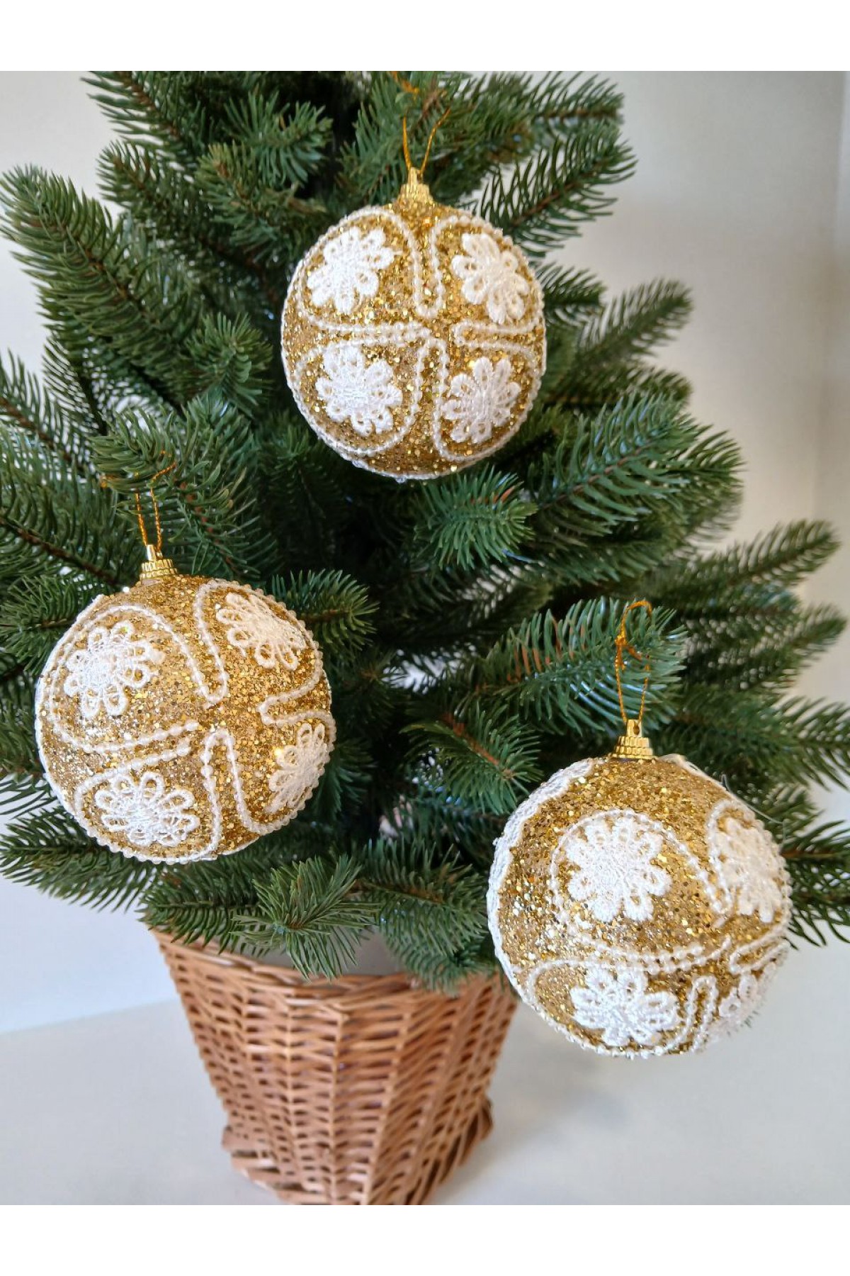 Набір ялинкових куль 8 см підійде для прикраси зелених, блакитних та засніжених ялинок розміром від 0,7 метра і вище. Кулі золотого кольору мають пластикову основу, декоровані білим орнаментом і блиском.