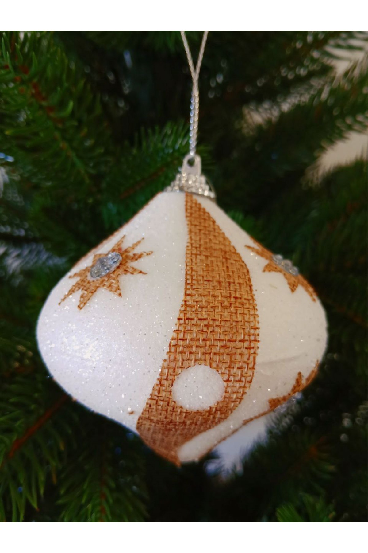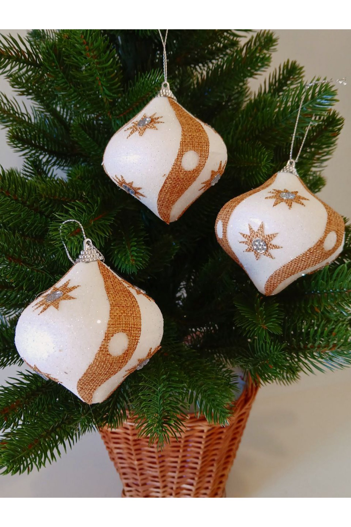 Набір ялинкових куль 8 см підійде для прикраси зелених, блакитних та засніжених ялинок розміром від 0,7 метра і вище. Кулі білі, мають пластикову основу, декоровані коричневою мішковиною.