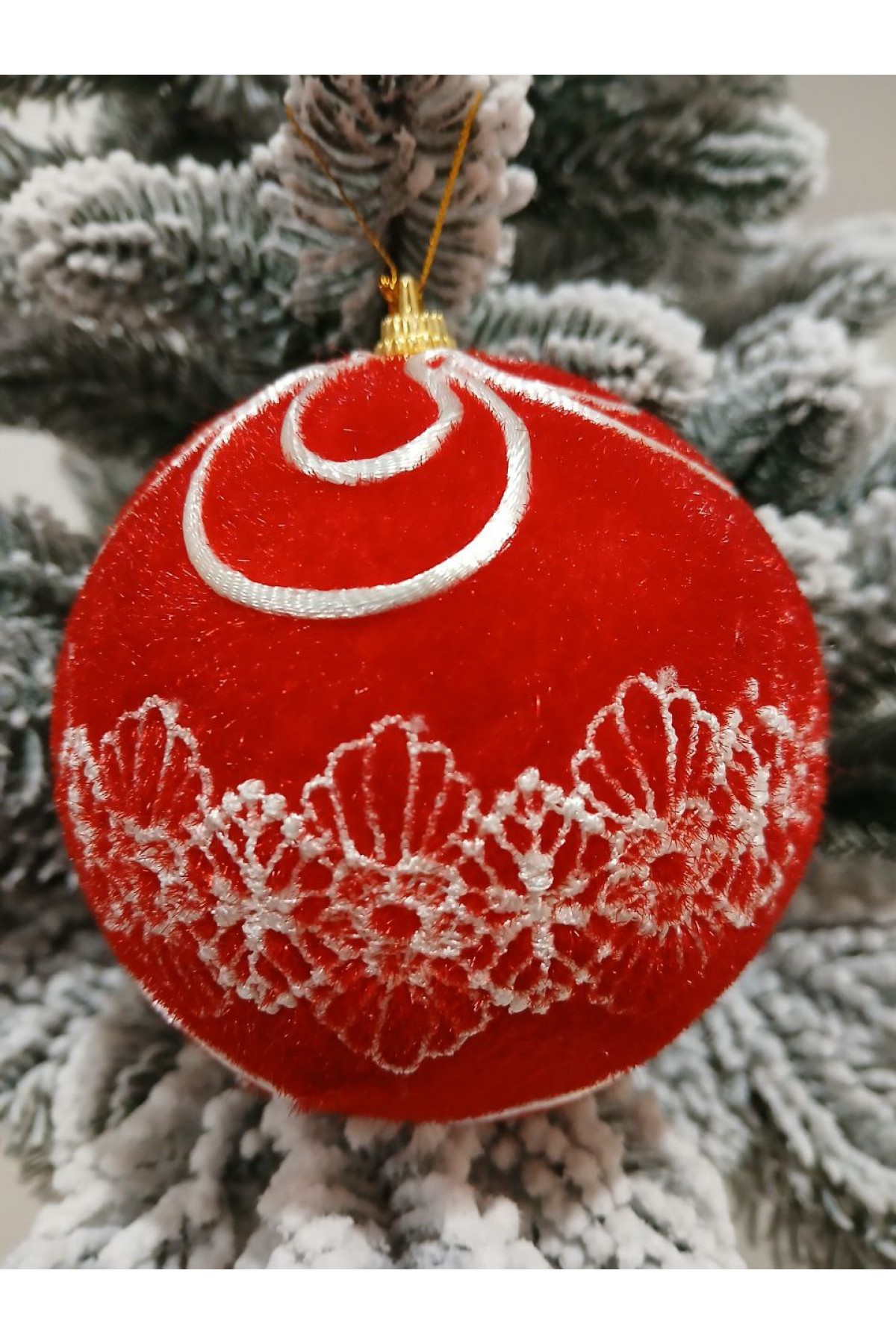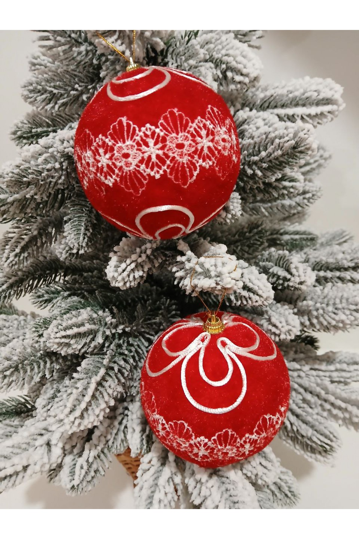 Набір ялинкових куль 10 см підійде для прикраси зелених, блакитних та засніжених ялинок розміром від 1,8 метра і вище. Оксамитові кулі червоного кольору мають пластикову основу, декоровані білим орнаментом.