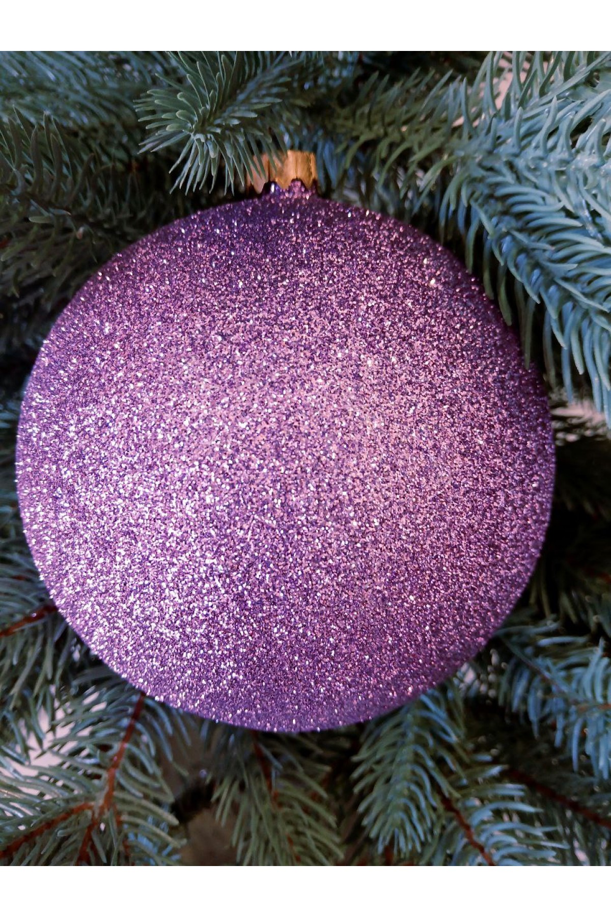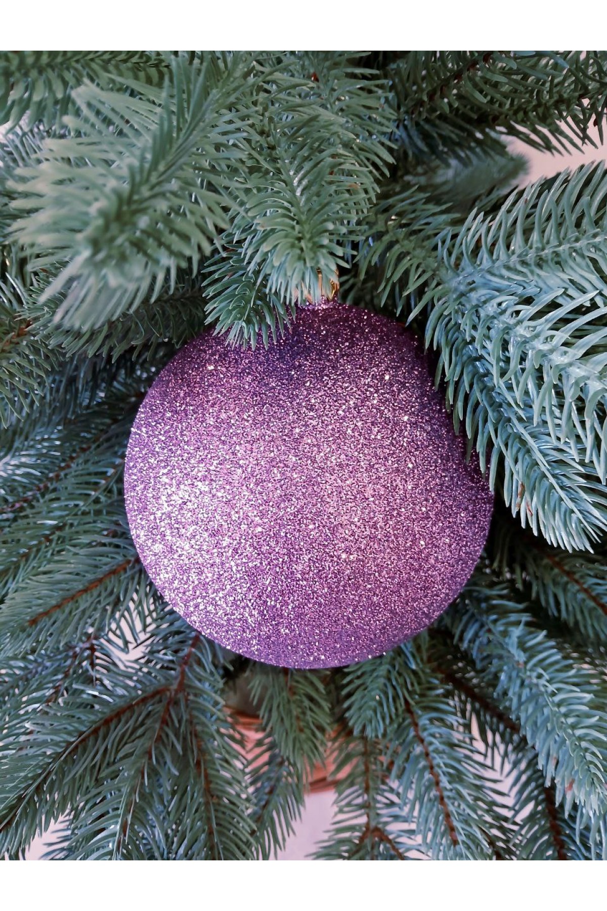 Ялинкові кулі 13 см підійдуть для прикраси зелених, блакитних та засніжених ялинок розміром від двох метрів і вище. Кулі бузкового кольору, мають пластикову основу, декоровані глітером.
